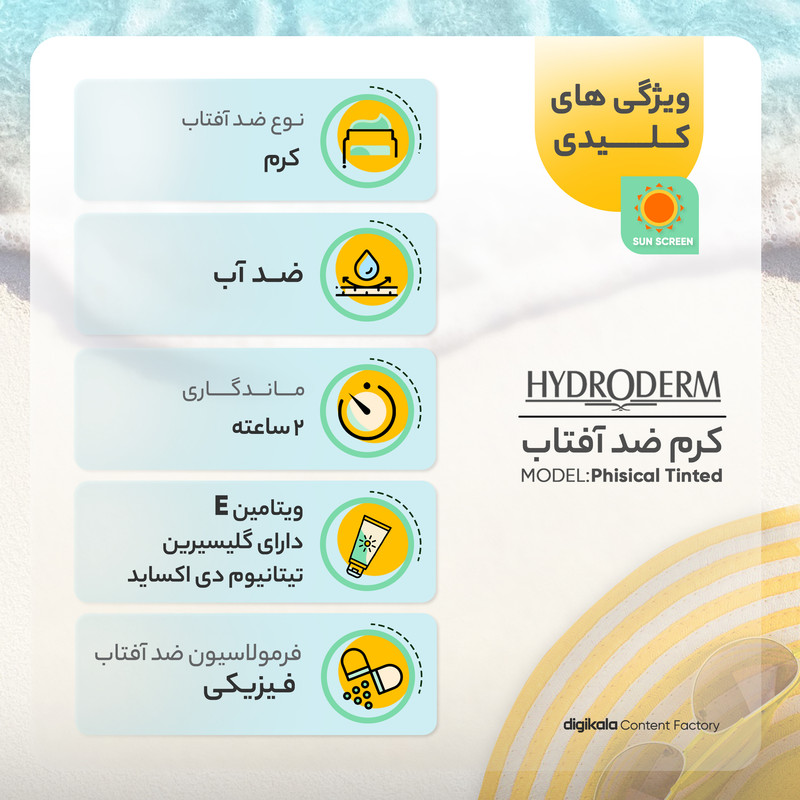 ویژگیهای ضدآفتاب : ضد آب , محافظت کننده در برابر اشعه UVA , محافظت کننده در برابر اشعه UVB , مرطوب کننده
