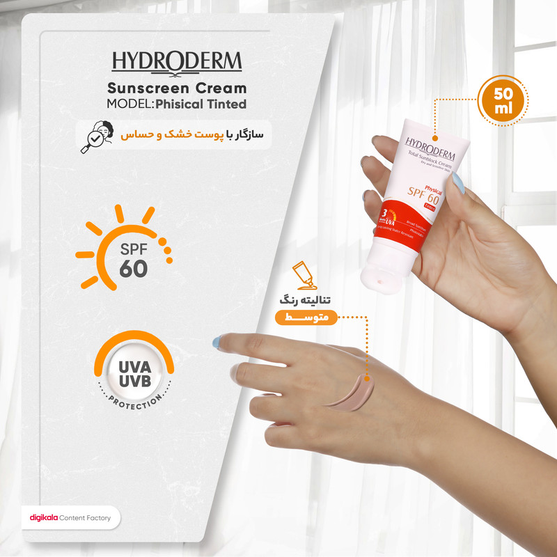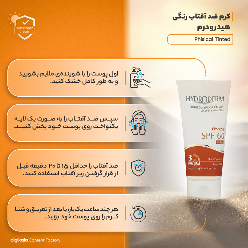 راهنمای استفاده : نيم ساعت قبل از خارج شدن از منزل و يا محل كار به مقدار كافی از كرم ضد آفتاب با فاكتور حفاظتی 60 هيدرودرم بر روی نقاطی از پوست كه در معرض تابش نور خورشيد قرار دارند ماليده و به خوبی ماساژ دهيد اين عمل را هر دو ساعت يكبار تجديد كنيد