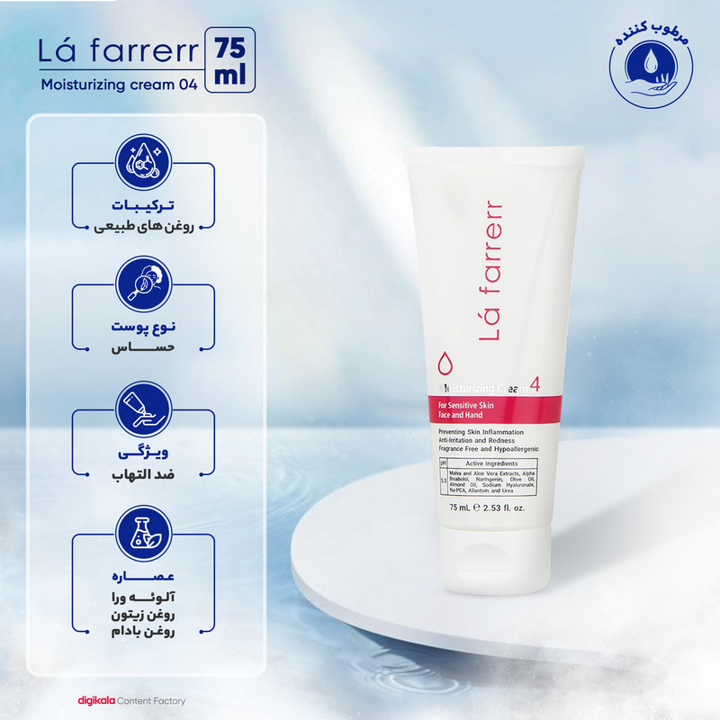 کرم مرطوب کننده و آبرسان لافارر مدل 04 با حجم 75 میلی لیتر، یک محصول مراقبتی متمایز است که برای پوست های حساس طراحی شده است. این کرم با داشتن مجوز از سازمان غذا و دارو، اطمینان از کیفیت و ایمنی را به همراه دارد.