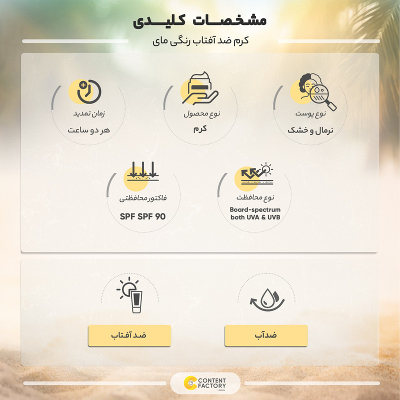 کرم ضدآفتاب مای حاوی روغن جوجوبا است که به مرطوب نگه داشتن پوست و تغذیه آن کمک میکند. این کرم به ویژه برای پوستهای خشک و معمولی طراحی شده و با ترکیبات مغذی خود، به رفع نیازهای مختلف پوستی کمک میکند. وجود گلیسیرین در این کرم، به حفظ رطوبت و نرمی پوست کمک کرده و از خشکی و ترکخوردگی جلوگیری میکند. زینک اکساید و تیتانیوم دی اکساید به عنوان فیلترهای معدنی، از پوست در برابر اشعههای مضر خورشید محافظت کرده و به کاهش التهابات پوستی کمک میکنند. ناگفته نماند این کرم دارای خواص ضد آب است که باعث میشود حتی در شرایط مرطوب و تعریق نیز اثر محافظتی خود را حفظ کند.