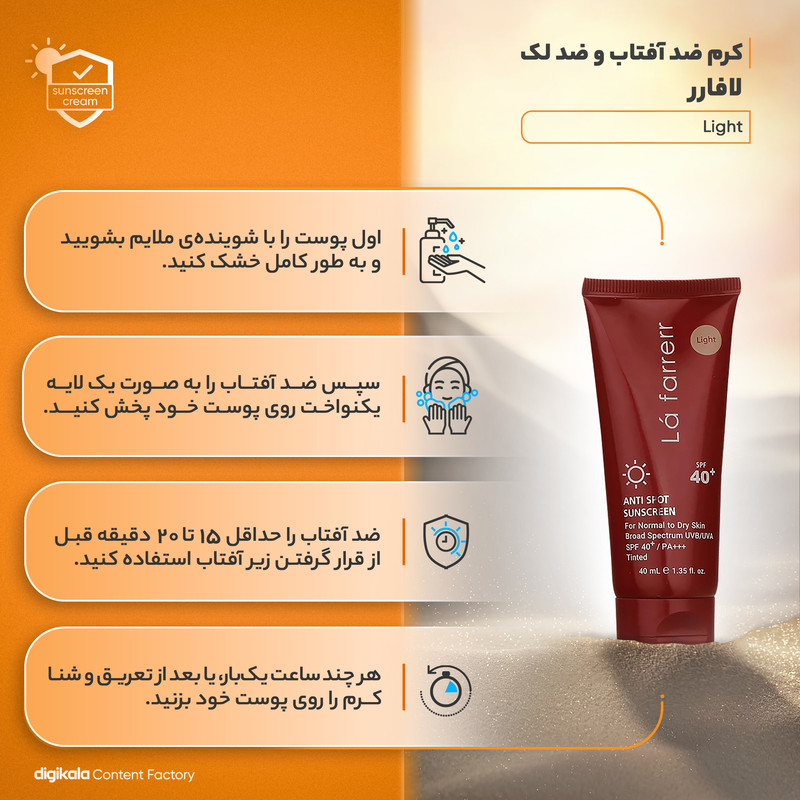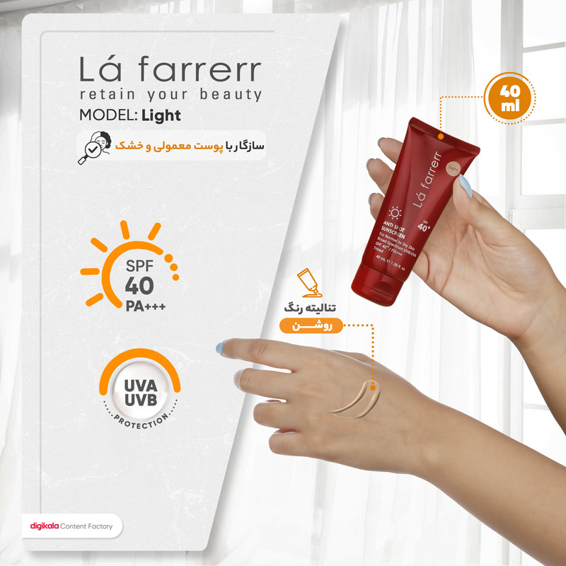 کرم ضدآفتاب و ضدلک رنگی لافارر مدل SPF40-Light، مناسب پوست‌های خشک و معمولی، حجم 40 میلی‌لیتر