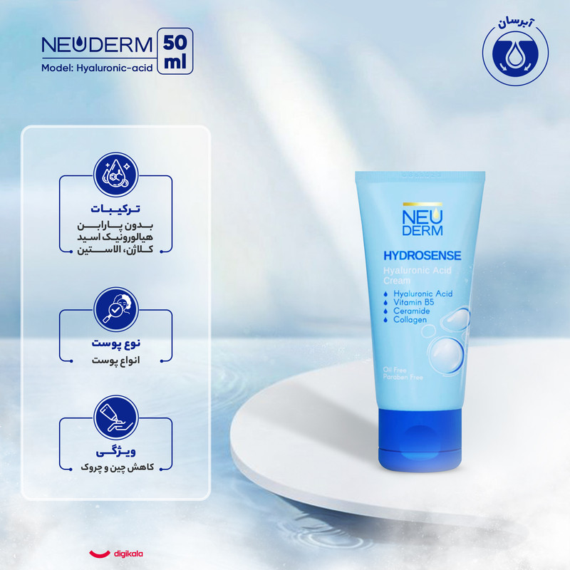 کرم هیالورونیک اسید هیدروسنس نئودرم، آبرسان و مرطوب کننده مناسب است که به راحتی رطوبت مورد نیاز پوست را تامین میکند. این کرم برای استفاده انواع پوست خصوصا پوستهای چرب مناسب بوده و پس از استفاده، به خوبی سطح پوست را نرم و لطیف میکند. این محصول با ترمیم کلاژن پوست کمک میکند تا انواع التهابات پوستی، خطوط ریز و چین و چروکها محو شوند.