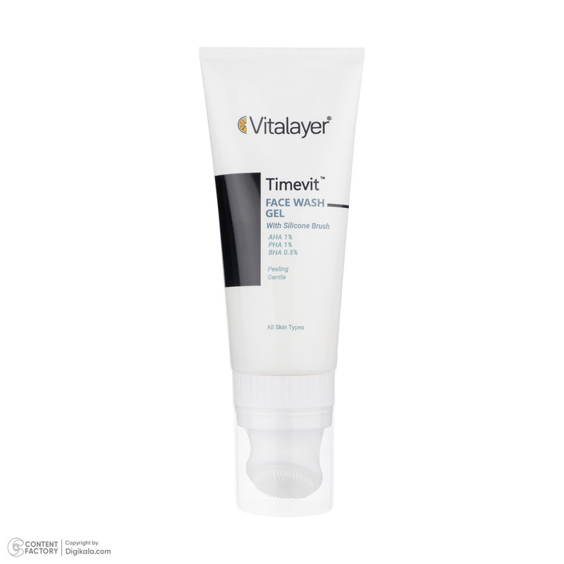 ژل براش شستشو صورت تایم ویت به دلیل داشتن AHA و PHA ملایم به همراه براش سیلیکونی موجب می شود سلول های مرده از سطح پوست پاک شوند و فرایند پاک سازی عمقی پوست به خوبی اتفاق بیافتد. در ضمن این ژل به علت داشتن نیاسینامید به رطوبت رسانی پوست نیز کمک میکند در ضمن در ترکیبات آن از آلانتوئین که ضد آلتهاب است نیز استفاده شده. ژل براش تایم ویت ویتالیر هیچ گونه ترکیب صابونی ندارد در نتیجه به حفظ سد دفاعی پوست کمک میکند.