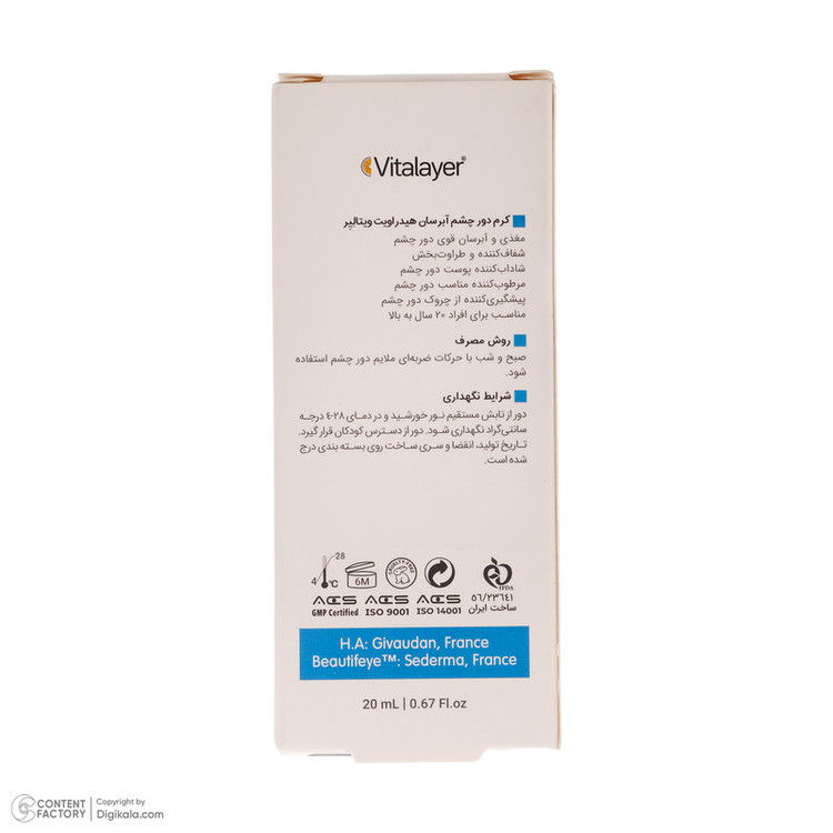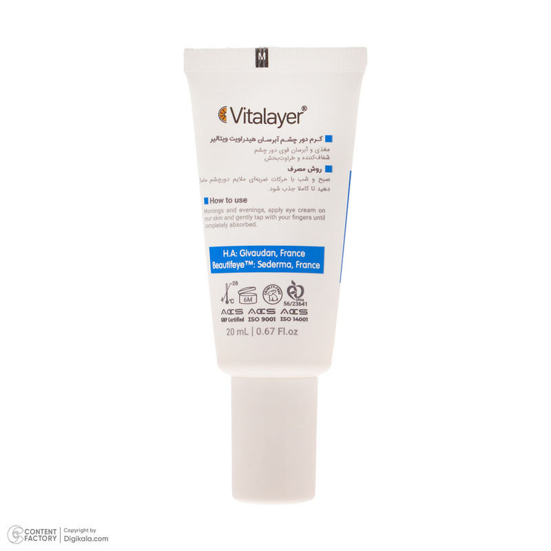 خواص: مغذی و آبرسان قوی دور چشم، شفافکننده و طراوتبخش، شاداب کننده پوست دور چشم، مرطوبکننده مناسب دور چشم، پیشگیری کننده از چروک دور چشم، مناسب برای افراد بالای 20 سال