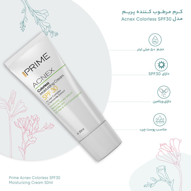 کرم مرطوب کننده بدون رنگ پرایم یک مرطوب کننده بدون روغن است. این مرطوب کننده که با نام Prime Acnex Colorless Moisturizing Cream نیز شناخته میشود که از SPF 30 بهره میبرد و با قابلیت کنترل ترشح سبوم و خاصیت ضد آکنه بودن، مهار کنندهی قوی باکتری های مولد آکنه به شمار میرود. این محصول پوششی طولانی و مناسب برای زخمهای آکنه است. همچنین این کرم یکی از بهترین کرمهای جاذب چربی پوست و مات کنندهی آن به شمار میرود. ضدجوش بودن یکی از مهمترین شاخصههاییست که برای این کرم مرطوب کننده ذکر شده است و این شاخصه شامل هر دو نوع جوش سرسفید و سرسیاه میشود.