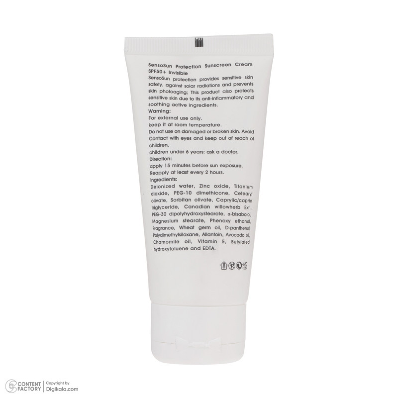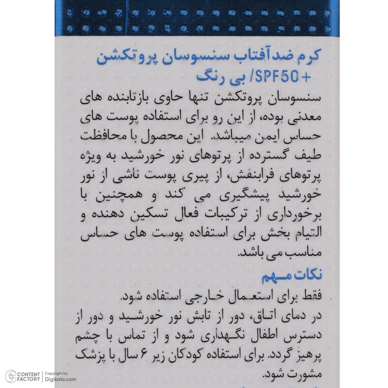 سنسوسان پروتکشن به عنوان یک ضد آفتاب طیف گسترده و 100% فیزیکال است که با استفاده از تکنولوژی نانو تنها حاوی بازتابند های معدنی در ابعاد نانو است. و از این رو برای استفاده پوست های حساس و تحریک شده ایمن و مناسب می باشد. همچنین با بافت سبک و جذب سریع این محصول دارای خواص تیکسوتروپیک است. سنسوسان پروتکشن با محافظت طیف گسترده از پرتوهای نور خورشید به ویژه پرتوهای فرابنفش از آفتاب سوختگی و پیری پوست ناشی از نور خورشید پیشگیری می کند و همچنین با برخورداری از ترکیبات فعال ضد التهاب مغزی و التیام بخش علاوه بر کاهش قرمزی و التهابات پوستی ناشی از آفتاب سوختگی روند بازسازی و ترمیم پوست آسیب دیده را تسریع می کند.