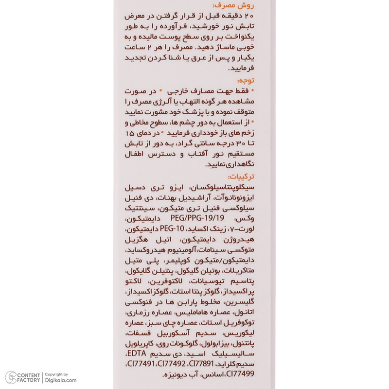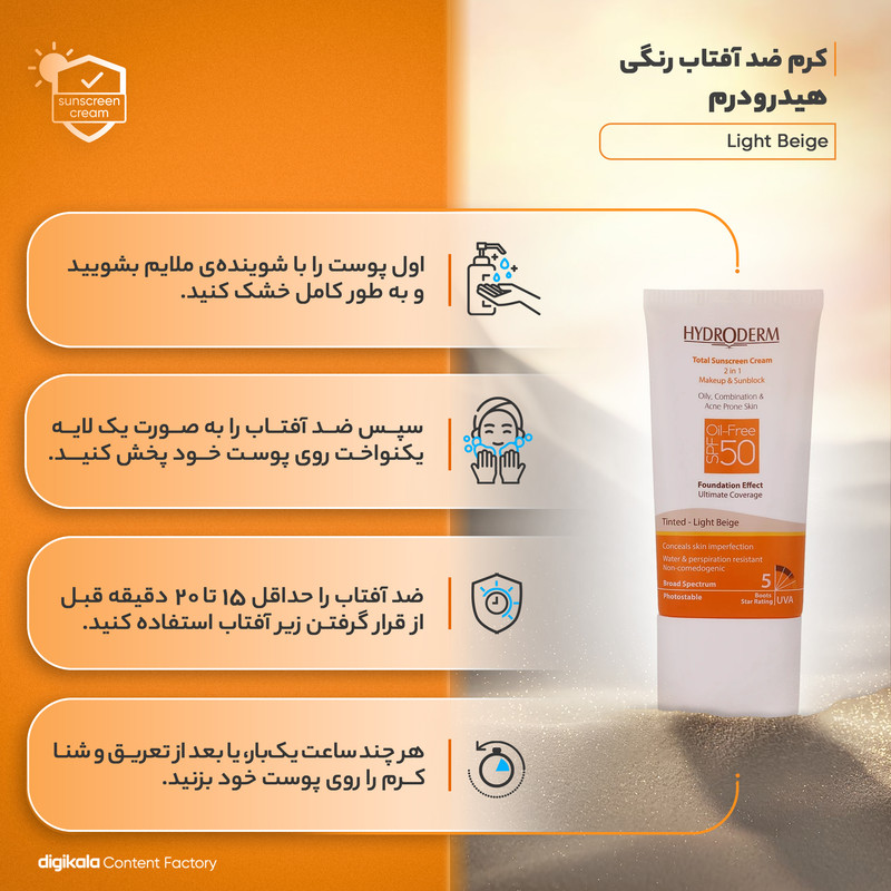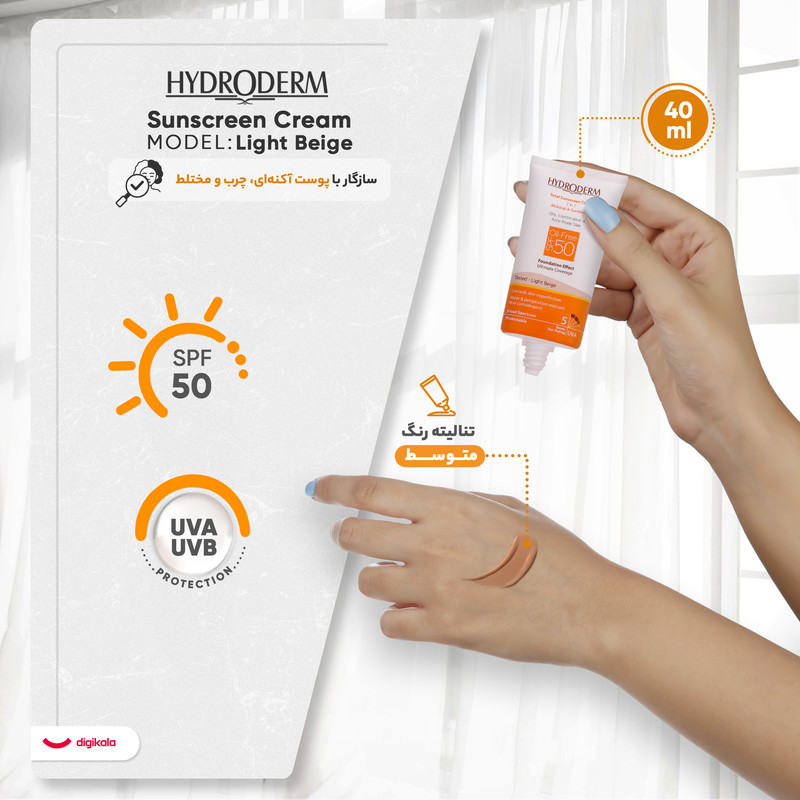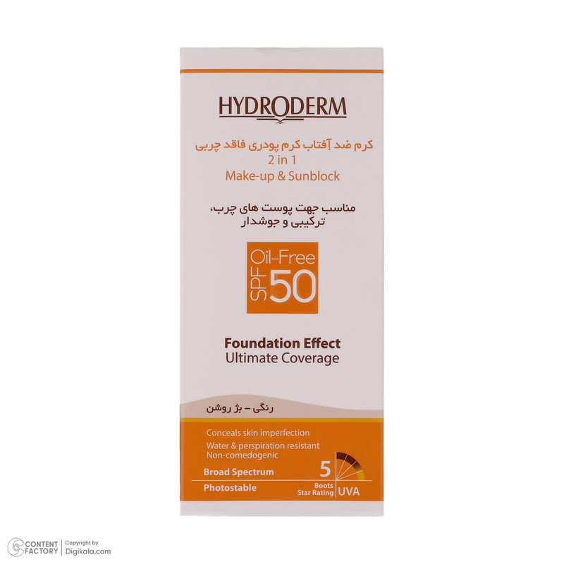 ضد آفتاب «هیدرودرم» (Hydroderm) با رنگ «بژ روشن» (Light Beige)، انتخاب مناسبی برای استفاده روزانه هم برای محافظت از پوست در برابر آفتاب و هم به عنوان پایه آرایش است. این ضد آفتاب بسیار مناسب برای پوستهای چرب، ترکیبی و جوشدار است. ترکیبات آن فاقد چربی بوده و ساختاری سیلیکونی و نرم دارد. این ضد آفتاب با SPF50 و دارا بودن پنج ستاره در سیستم اندازهگیری فیلتر آفتاب، یک محافظ عالی برای پوست در برابر اشعههای مضر خورشید (UVA , UVB) است. ضد آفتاب هیدرودرم علاوهبر محافظت طولانی مدت از پوست در برابر آفتاب، پوششی ابریشمی و یکسان روی پوست ایجاد میکند. پوشش این کرم حتی نیاز به استفاده از کرم پودر یا پنکیک برای آرایش روزانه را نیز از بین میبرد. دیگر ویژگی خوب این کرم، دارا بودن مقاومت خوب در برابر تعریق و شستوشو است. ضد آفتاب هیدرودرم با رنگ بژ روشن انتخاب خوبی برای قرارگیری طولانی در آفتاب است.