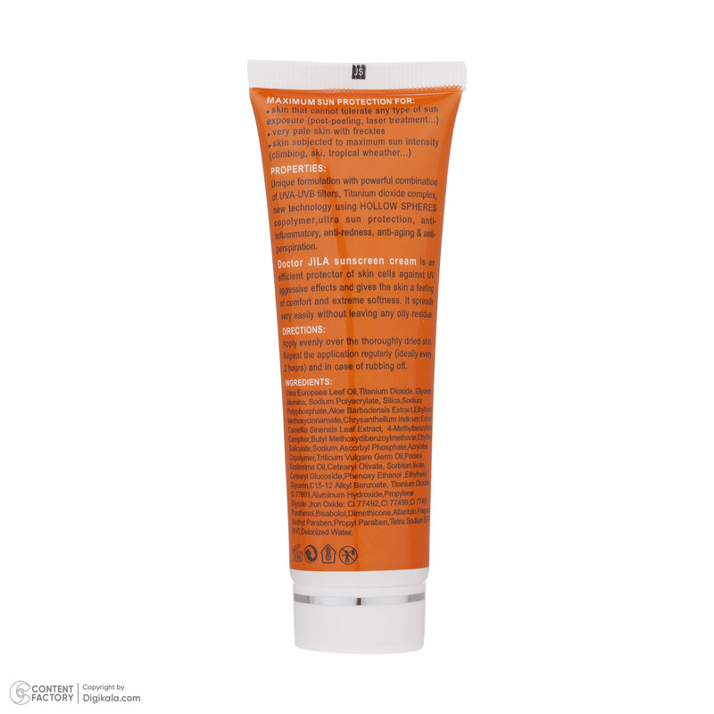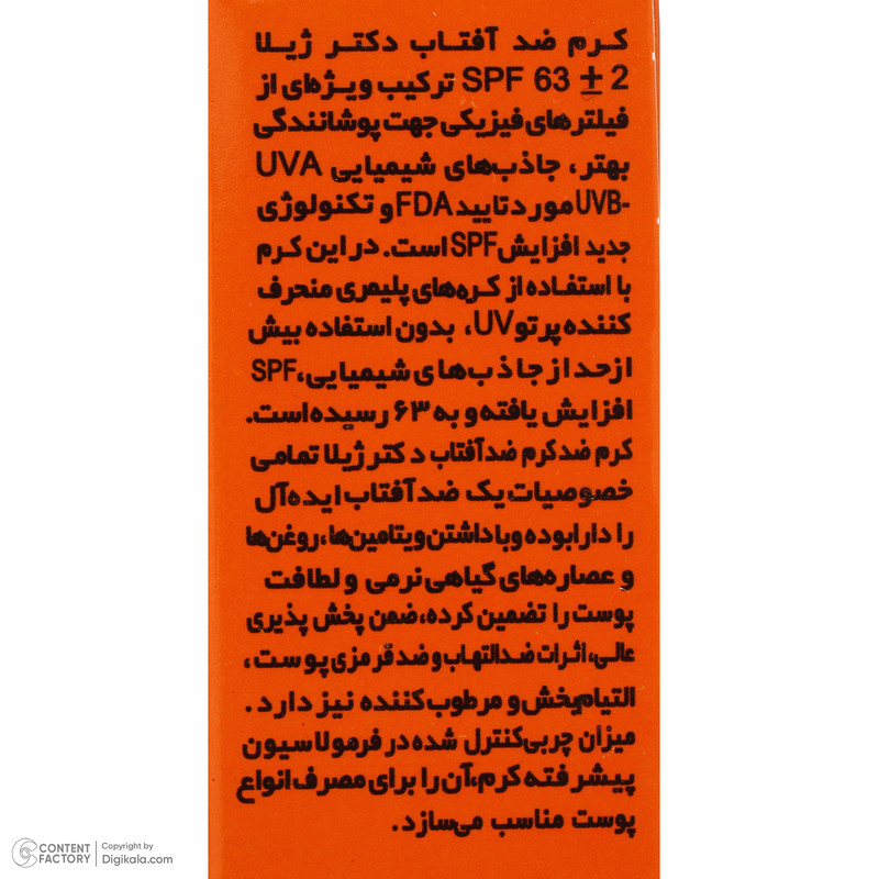 کرم ضد آفتاب دکتر ژیلا با فرمولاسیون منحصر به فرد خود، ترکیب ویژه ای از فیلترهای فیزیکی با تکنولوژی نانو جهت پوشانندگی بهتر، جاذب های شیمیایی UVA-UVB مورد تأیید FDA و تکنولوژی مدرن افزایش SPF می باشد. در این کرم با استفاده از کره های پلیمری منحرف کننده پرتوهای UV و کمپلکس گیاهی پونگامول SPF افزایش یافته و به 63 رسیده است. کرم ضد آفتاب دکتر ژیلا تمام خصوصیات یک ضد آفتاب ایده آل را دارا بوده و با داشتن ویتامین ها، روغن ها و عصاره های گیاهی نرمی و لطافت پوست را تضمین کرده، ضمن پخش پذیری عالی، اثرات ضد التهاب و قرمزی پوست، التیام بخش و مرطوب کننده و کاهش دهنده تعریق دارد. در ضمن میزان چربی کنترل شده در فرمولاسیون پیشرفته کرم، آن را برای مصرف انواع پوست مناسب می سازد.