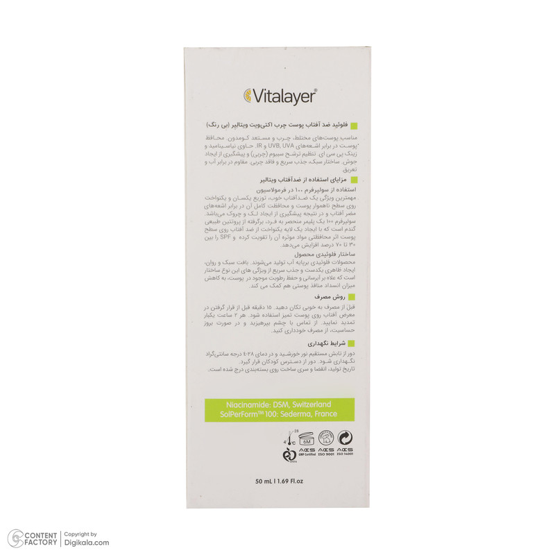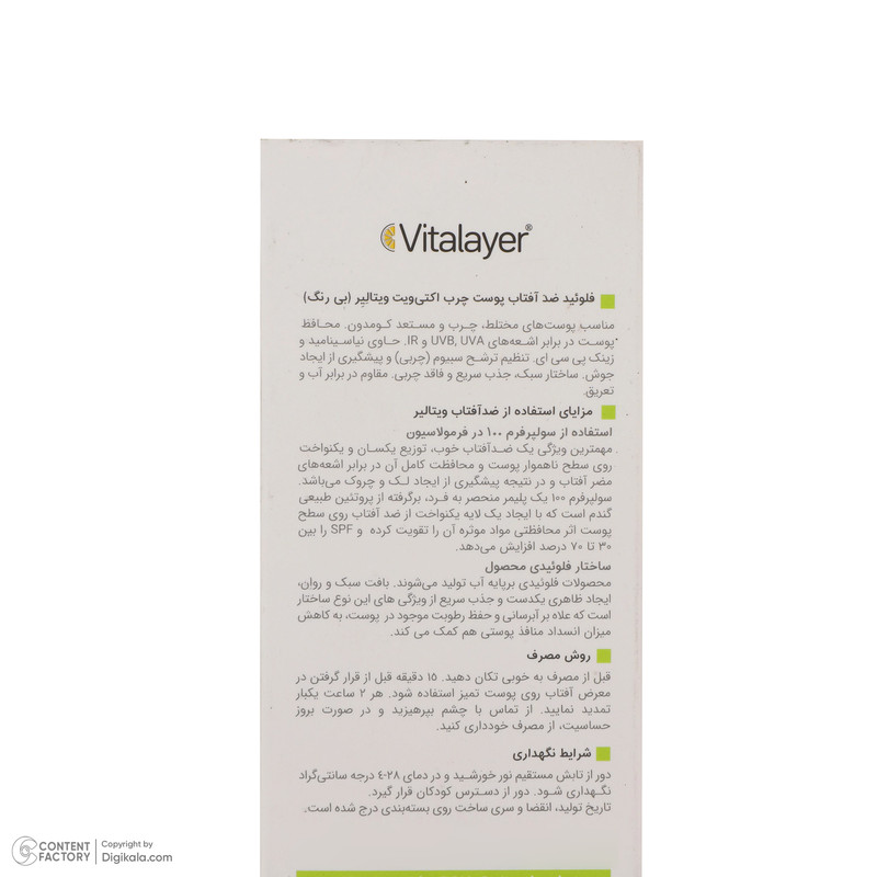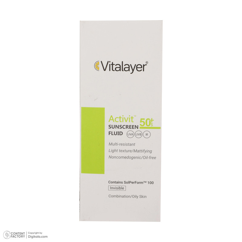فلوئید ضدآفتاب ویتالیر مدل Activit با SPF 50 به دلیل بیرنگ بودن، به راحتی روی پوست محو میشود و میتواند بهعنوان پایه آرایش نیز استفاده شود. این محصول، با جلوگیری از انسداد منافذ پوست و کنترل چربی، به حفظ تعادل طبیعی پوست کمک میکند و آن را در تمام طول روز مرطوب و شاداب نگه میدارد. با استفاده از فلوئید ضدآفتاب بیرنگ ویتالیر مدل Activit، میتوانید از پوست خود در برابر اشعههای مضر خورشید محافظت کنید و همزمان از احساس سبکی و تازگی بر روی پوست خود لذت ببرید.