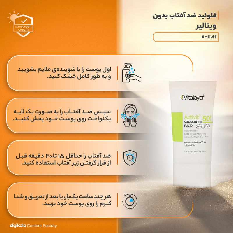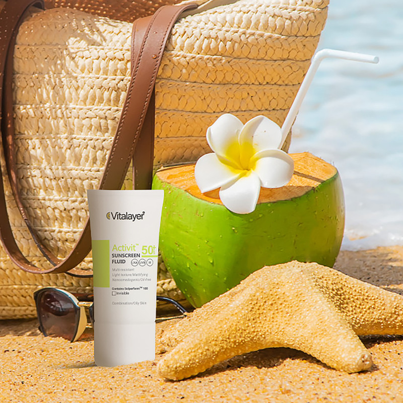 فلوئید ضدآفتاب بیرنگ ویتالیر مدل Activit با SPF 50 یک محصول ایدهآل برای محافظت از پوستهای مختلط و چرب در برابر اشعههای مضر خورشید است. این فلوئید با فرمولاسیون سبک و فاقد چربی، بهخصوص برای پوستهای مستعد جوش و آکنه مناسب بوده و از بروز کومدونهای ناخوشایند جلوگیری میکند.