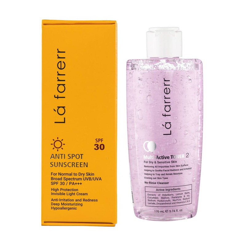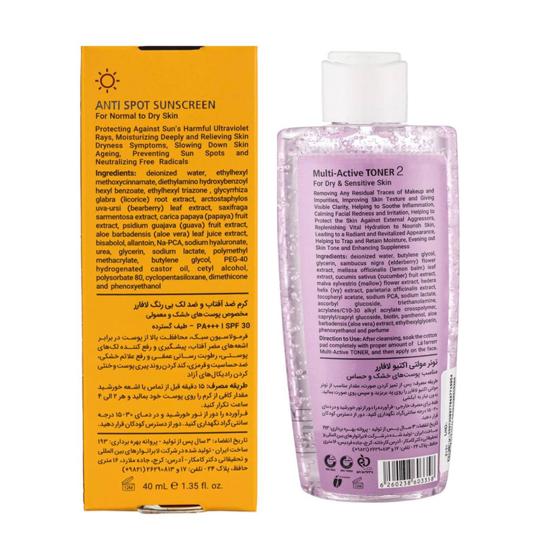 تونر مولتی اکتیو لافارر مناسب پوست های خشک و حساس تنظیم PH پوست همراه با حفظ رطوبت و رفع التهابات پوستی حاوی سدیم هیالورونات ، سدیم لاکتات ، عصاره های گیاهی ملیسا ، پاریتاریا ، پیچک و خیار و ویتامین های C و E و ... میباشد.