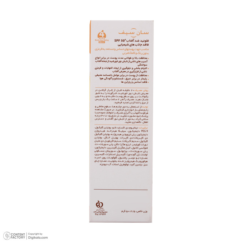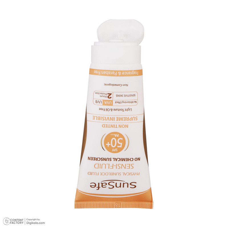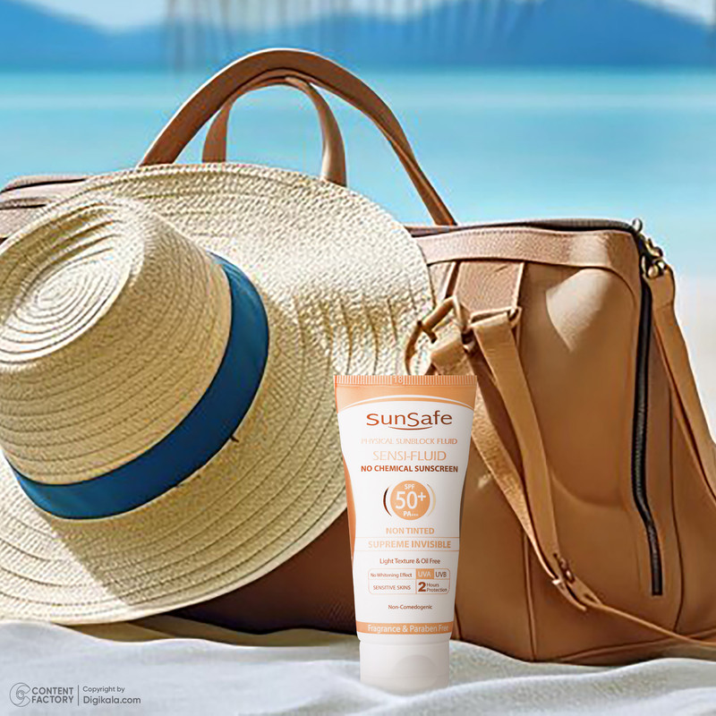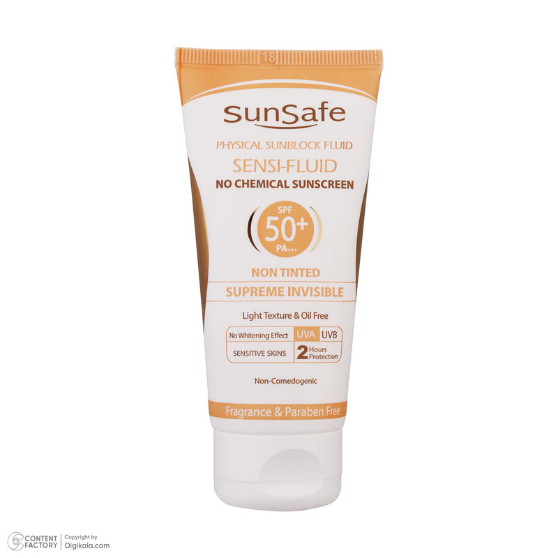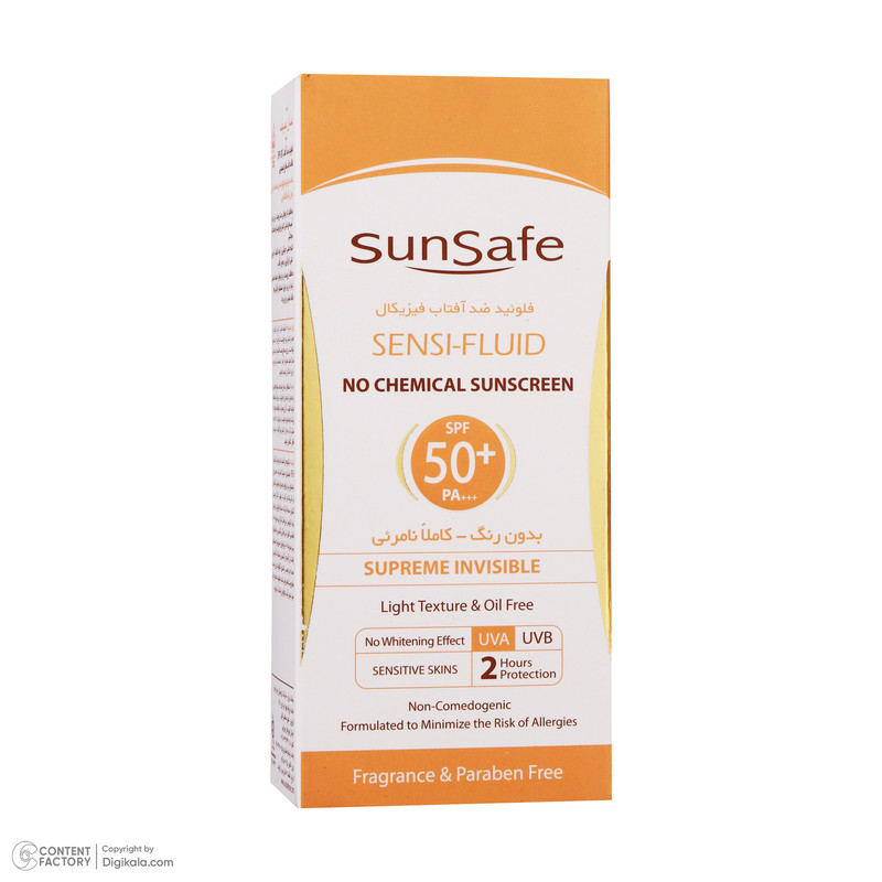 تولید ضد آفتاب سنسی فلوئید +SPF 50 سان سیف، عصر جدیدی در حفاظت پوست در برابر در درماتولوژی به شمار می رود. این ضد آفتاب فلوئید حفاظت وسیعی در برابر اشعه های UVA1 UVA2 و UVB ایجاد می کند که به واسطه میکروتیتانیوم دی اکسید است که یک سپر دفاعی برای پیشگیری اشعه های خورشید ایجاد می کند. ضد آفتاب سنسی فلوئید، حفاظت وسیعی در برابر اشعه های UVA و UVB ایجاد می نماید. کمپلکس ویتامین E+B3 و چای سبز، از آسیب DNA پوست در اثر خورشید جلوگیری می کند. این محصول بر پایه سیستم نوین Water Gel فرموله شده است و در نتیجه فاقد امولسیفایر است.