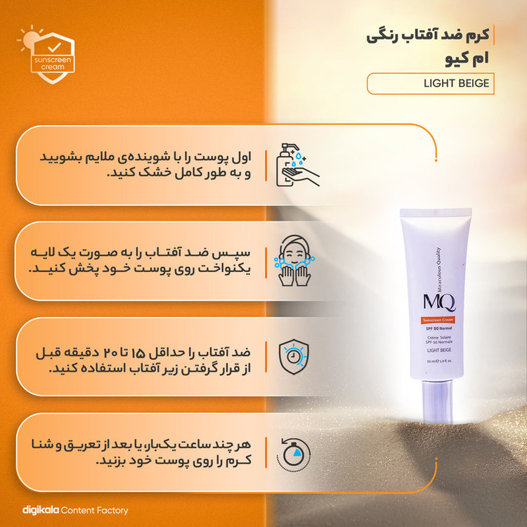 راهنمای استفاده : 30 دقیقه قبل از قرار گرفتن در معرض تابش نور خورشید مقداری از کرم ضد آفتاب نرمال ام کیو MQ را بر روی پوست خود قرار داده و با ملایمت آن را پخش نمایید. در صورتیکه به مدت طولانی در معرض نور خورشید قرار دارید، هر دو ساعت یکبار آن را تجدید کنید.