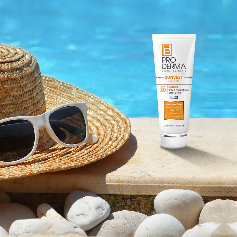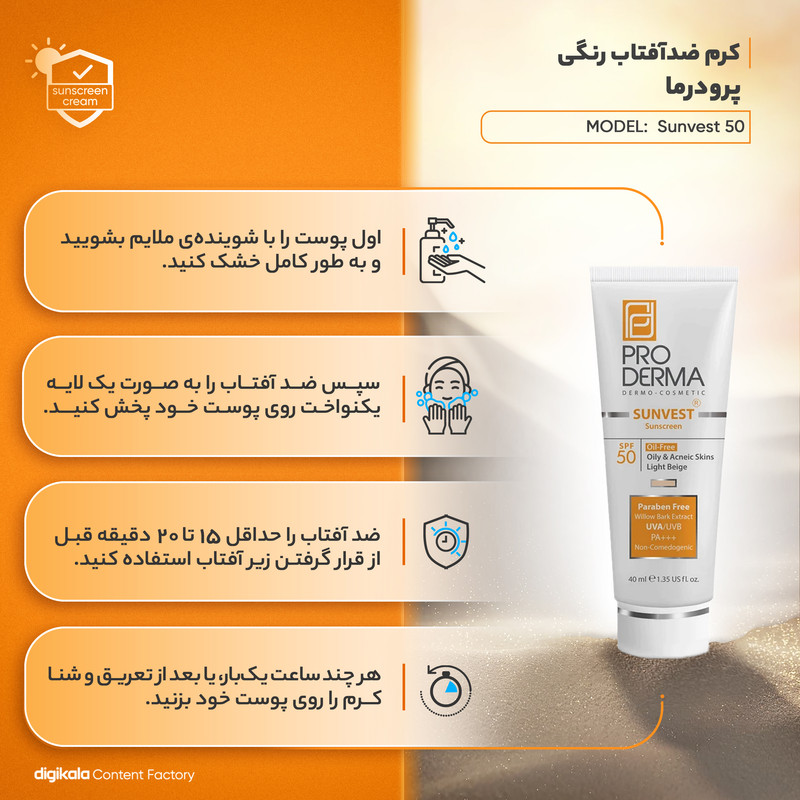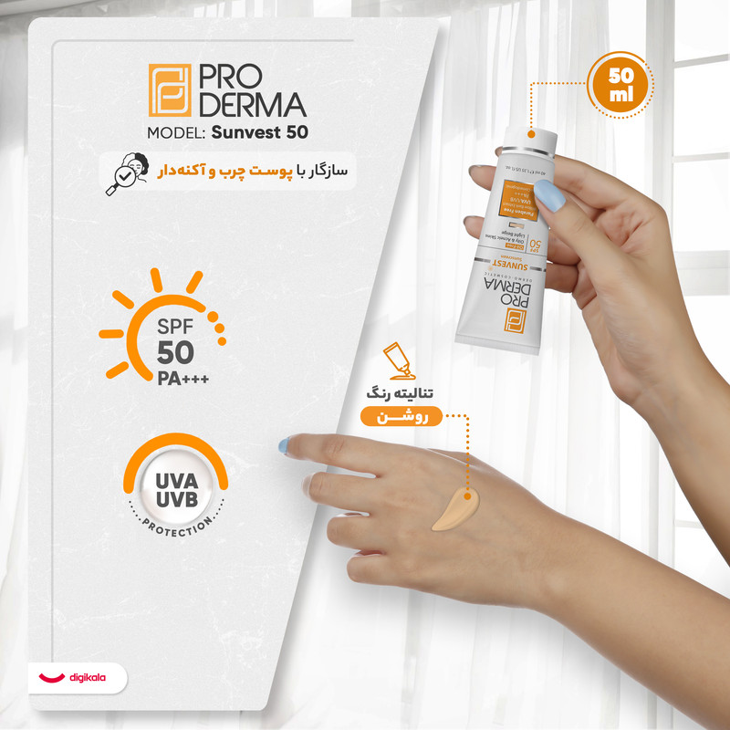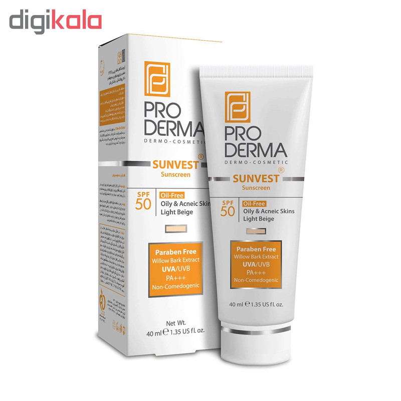 کرم ضد آفتاب رنگی پرودرما، SPF 50، مدل 50 Sunvest، مناسب پوست‌‌های آکنه‌دار و چرب با تنالیته روشن و حجم 40 میلی‌لیتر، محافظت‌کننده در برابر اشعه‌های UVA و UVB، غیر کومدون‌زا و فاقد پارابن، PA+++، دارای فرمولاسیون فاقد چربی،با ماندگاری 2 ساعته