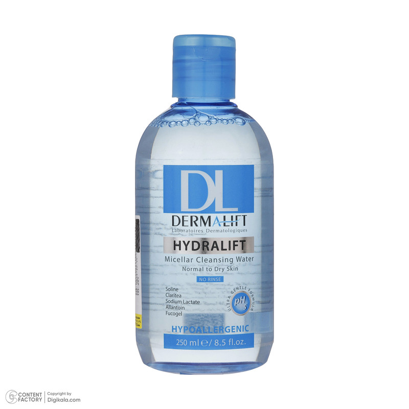محلول پاک کننده آرایش صورت درمالیفت مدل HYDRALIFT مناسب برای پوست های معمولی و خشک حجم 250 میلی لیتر