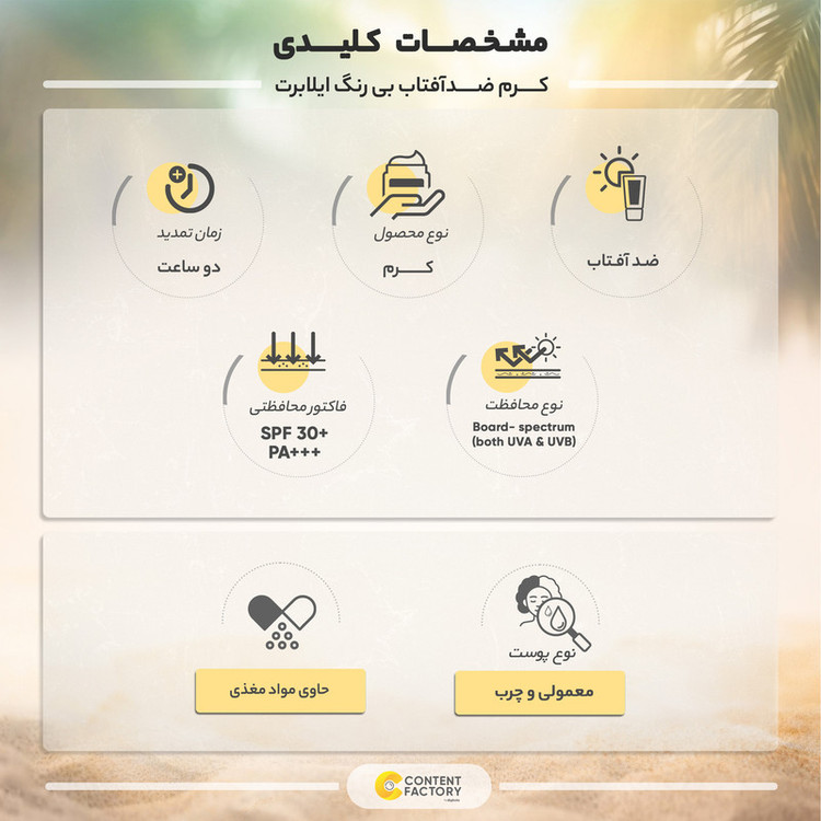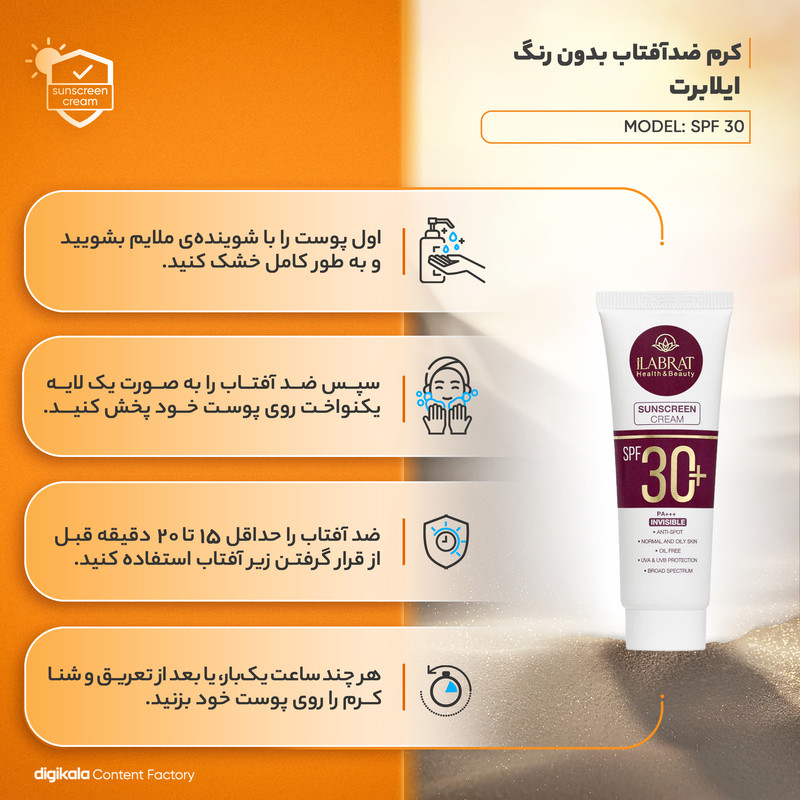راهنمای استفاده : 15 دقیقه قبل از قرار گرفتن در برابر نور خورشید، مقدار کافی از کرم را به طور یکنواخت بر روی پوست تمیز استفاده کنید. این کار را هر دو ساعت یکبار یا پس از شنا یا تعرق زیاد تکرار نمایید.