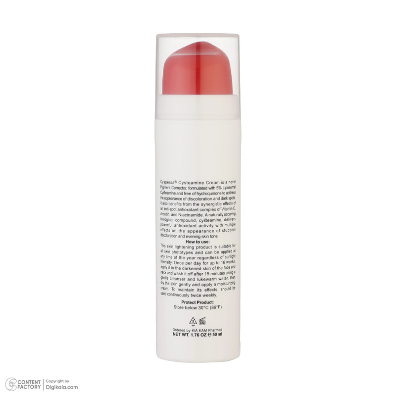 کرم ضدلک سیستئامین سیسپرسا حاوی سیستئامین لیپوزومی و کمپلکس آنتی اکسیدان (حاوی ویتامین سی، نیاسینامید و آربوتین) ترکیبی قوی برای درمان لکهای پوستی مانند ملاسما، کک و مک، لکهای ناشی از اختلالات کبدی، لکهای ناشی از افزایش سن، هایپرپیگمانتاسیون بعد از التهاب و لنتیگو است.