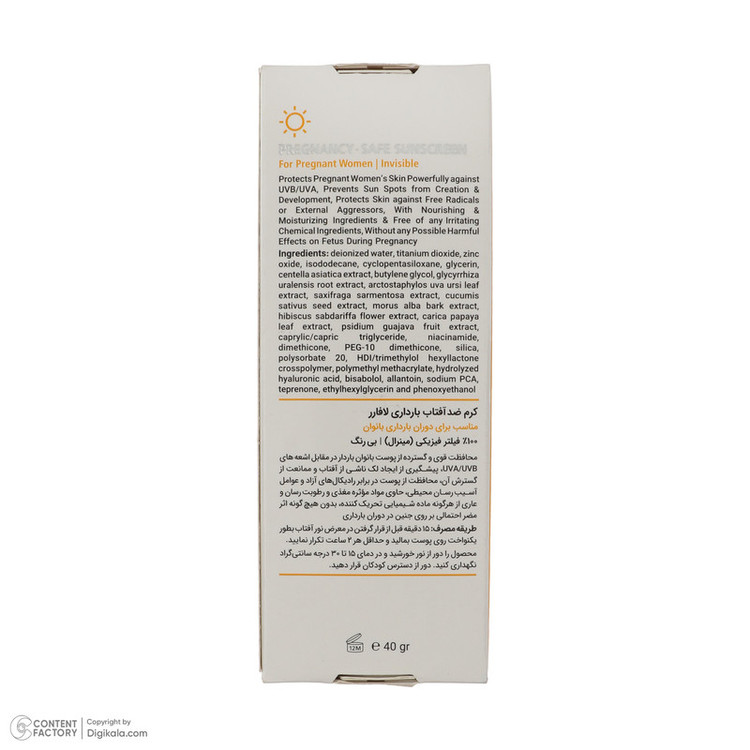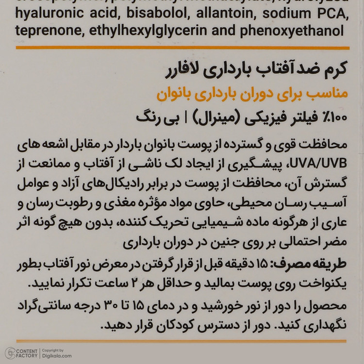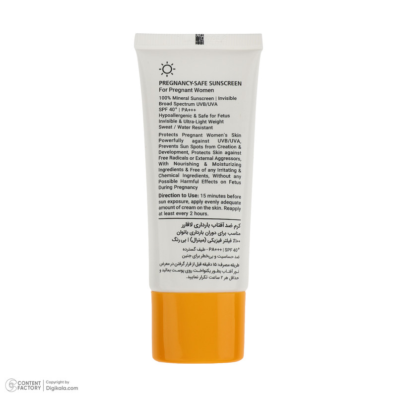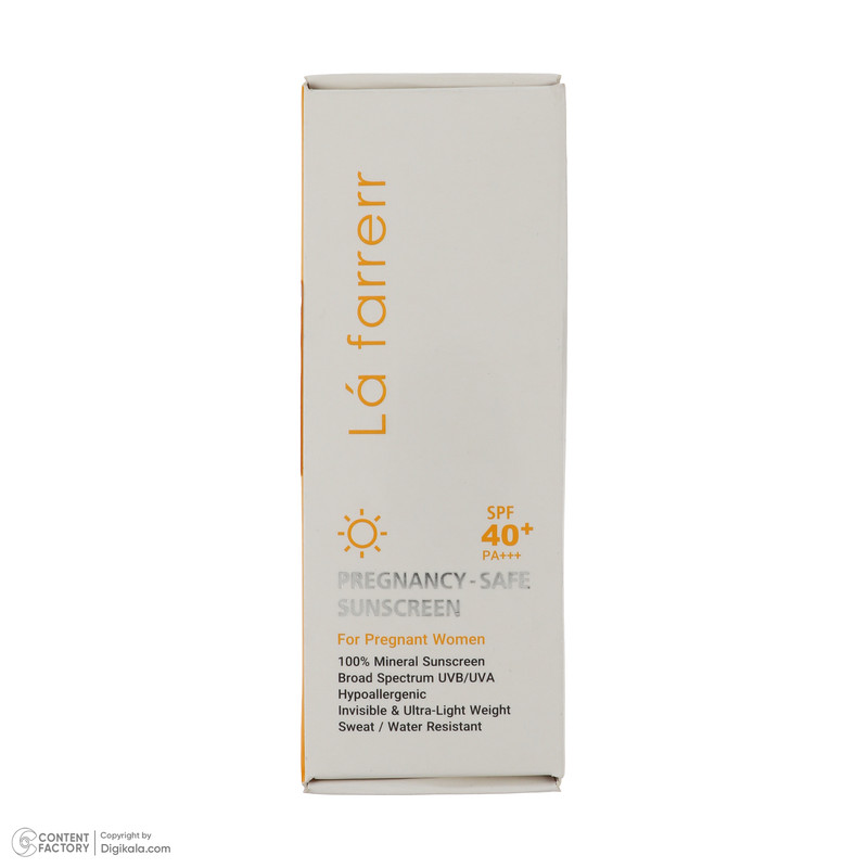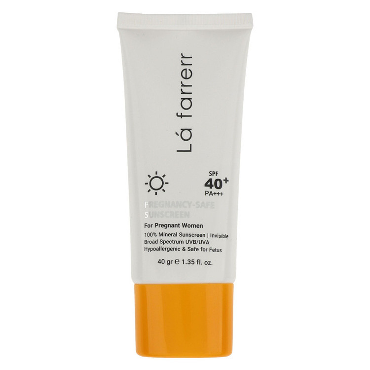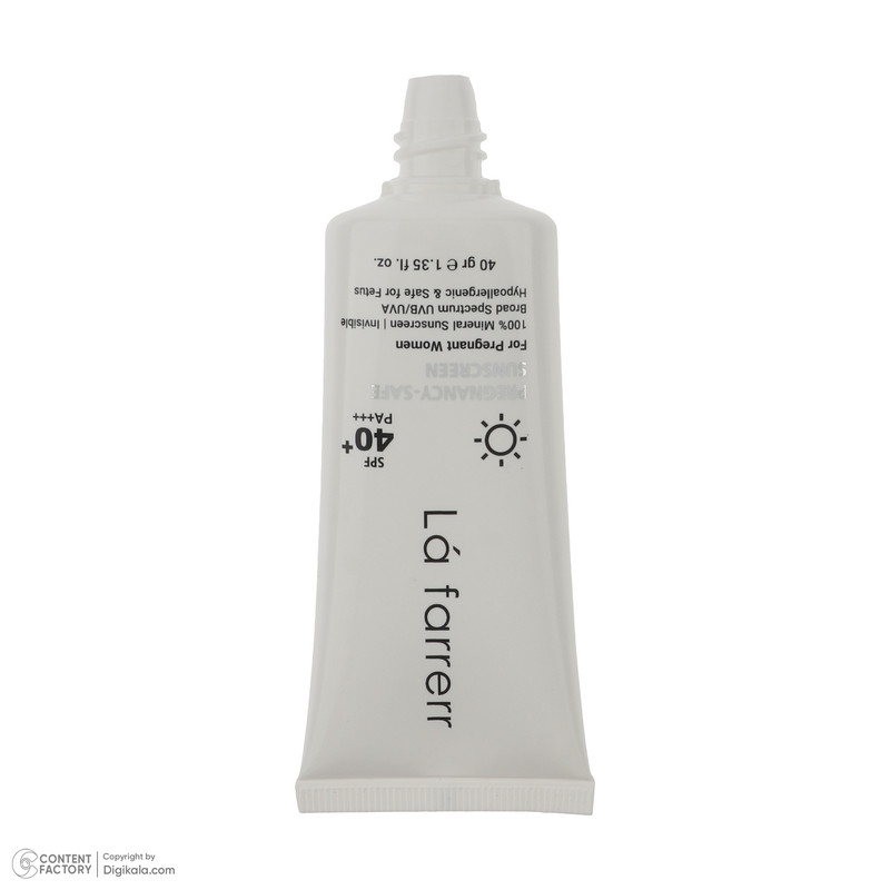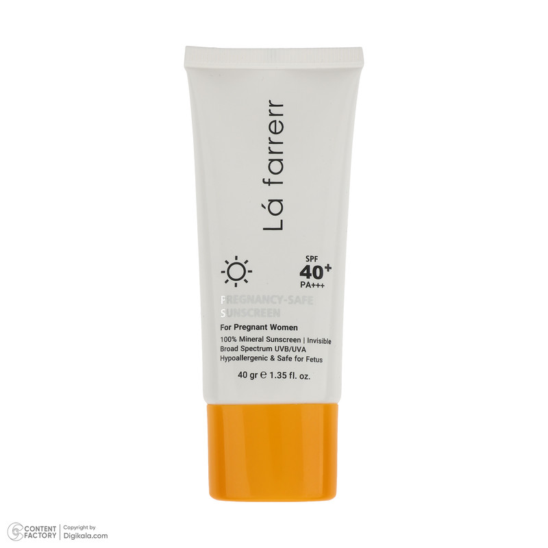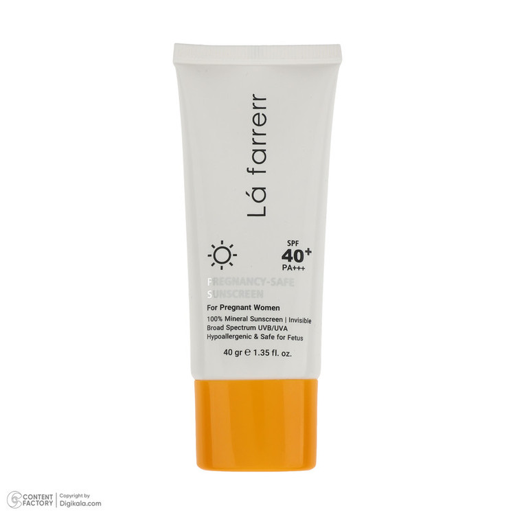کرم ضد آفتاب بدون رنگ لافارر SPF 40 مدل PREGNANCY SAFE، حاوی محافظ UVA و UVB و PA+++ مناسب پوست بانوان باردار حجم 40 میلی‌لیتر