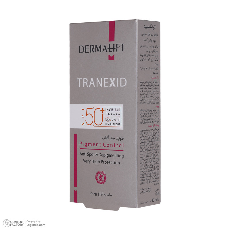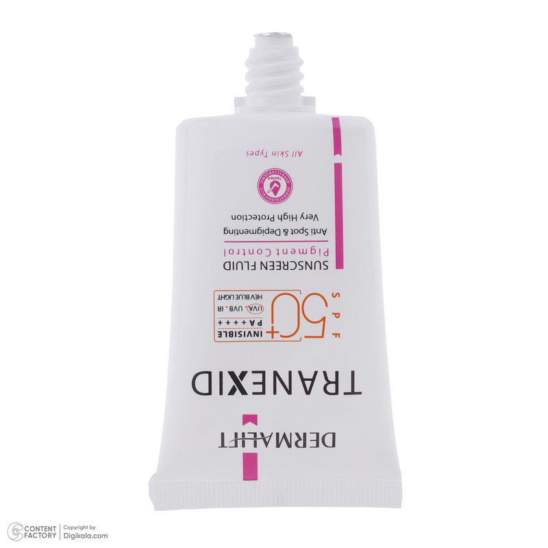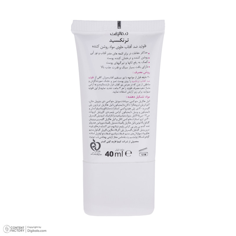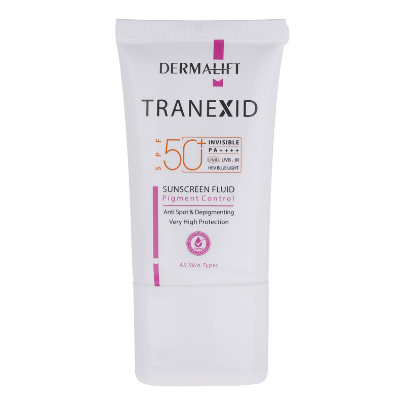 فلوئید ضد آفتاب روشن کننده ترنکسید SPF50 درمالیفت بر خلاف کرم بافت سبکی دارد و همانطور که از نامش پیداست، مانند مایع روان بوده و غلظت پایینی دارد. به علت جذب بسیار سریع این محصول و عدم ایجاد چربی اضافی، تمامی افراد با هر نوع پوستی میتوانند از فلوئید ضد آفتاب ترنکسید استفاده نمایند. این محصول حاوی جدیدترین و موثرترین مواد روشن کننده پوست بوده و باعث رفع انواع تیرگیها و لکهای مقاوم به درمان در ناحیه صورت، گردن و پشت دستها میشود. استفاده همزمان از کرم روشن کننده و فلوئید ضد آفتاب ترنکسید درمالیفت، باعث تاثیر چشمگیری در درمان تیرگیها میشود.