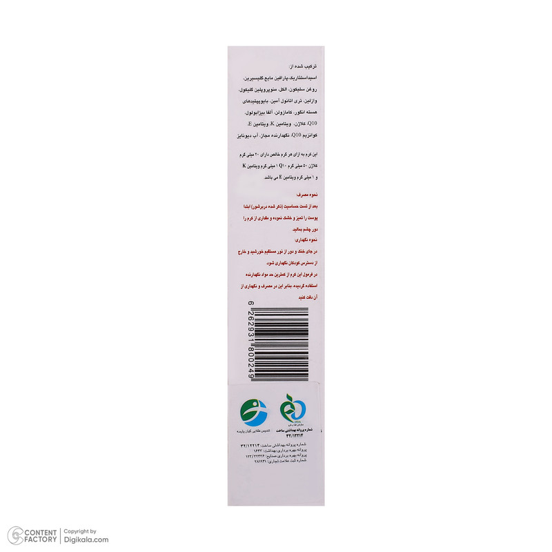 سایر مشخصات: این کرم به ازای هر گرم خالص دارای 20 میلی گرم کلاژن 50 میلی گرم Q10 و 1 میلی گرم ویتامین K و 1 میلی گرم ویتامین E است.