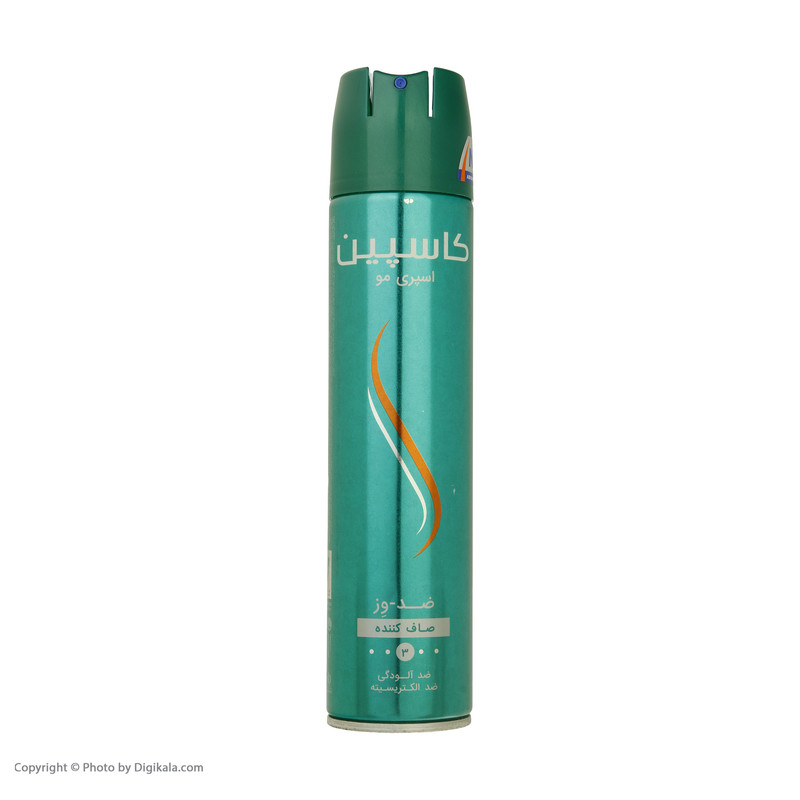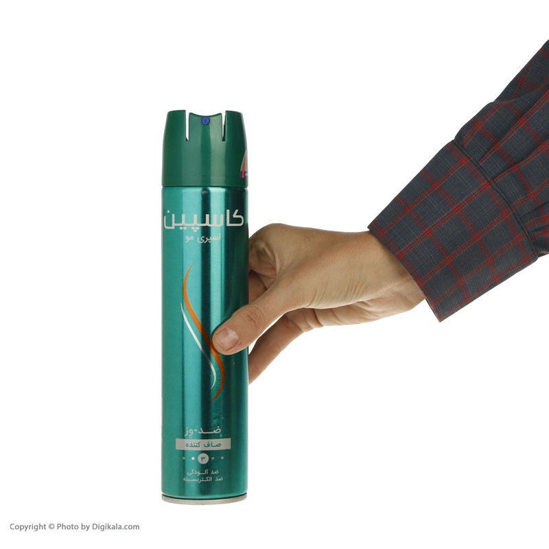 اسپری حالت دهنده و ضد وز مو کاسپین حجم 250 میلی لیتری با ویژگی درخشان کننده، تثبیت کننده و صاف کننده مو با قدرت نگهداری حالت مو سطح 3