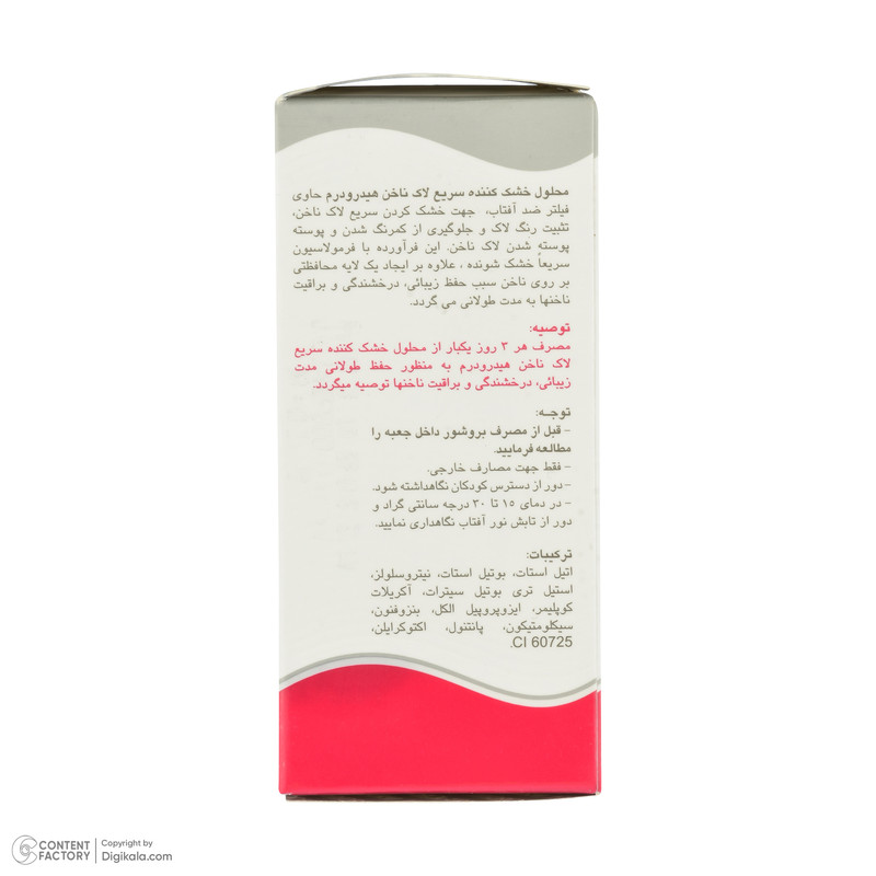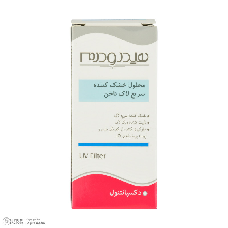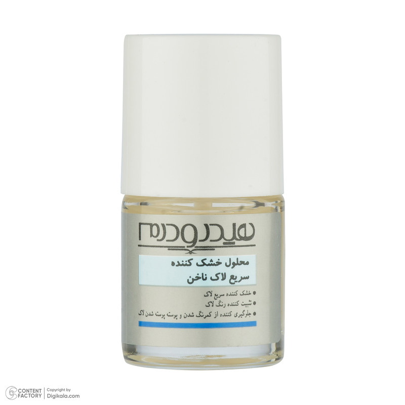 لاک زدن یکی از علایق اصلی همهی خانمها به شمار میرود و بهدنبال آن خشک شدن سریع لاک نیز مهم بوده اشت؛ لاک خشک کن که توسط شرکت هیدرودرم معرفی شده است دارای فیلتر ضد آفتاب بوده و از پوستهپوسته شدن و کمرنگ شدن لاک جلوگیری میکند. لابراتور پارس حیان محصولات خود را با برند هیدرودرم «Hydroderm» به بازار معرفی کرده است که یکی از بزرگترین تولیدکنندگان محصولات آرایشی و بهداشتی در سطح خاورمیانه بوده و با برندهای هم رده خود رقابت چشمگیری دارد. فیلتر ضد آفتاب در این محصول باعث شده که از ناخن شما در برابر عواملی که از سمت نور خورشید و اشعههای مضر آفتاب ساطع میشود محافظت کند. هنگام استفاده از لاک به مدت طولانی ممکن است با پوسته پوسته شدن، کمرنگ شدن و حتی کدر شدن لاک برخورد کنیم اما این محلول نه تنها باعث افزایش عمر لاک میشود بلکه شاهد این اثرات بر روی ناخن نخواهیم بود. این محصول رنگ لاک را تثبیت میکند و با اثر براق کنندهای که دارد از کدر شدن لاک جلوگیری میکند؛ فرمولاسیون استفاده شده در این محلول با اثر خشک کنندگی سریع لاک و ماندگاری بالا زیبایی ناخنهایتان را تشدید خواهد کرد. محلول خشککننده سریع ناخن از برند هیدرو درم با حجم 8 میلیلیتر جهت خشک شدن سریع لاک، طول عمر لاک، تثبیت رنگ لاک و جلوگیری از پوسته پوسته شدن لاک با توجه به نیاز مشتریان در دسترس قرار گرفته است.