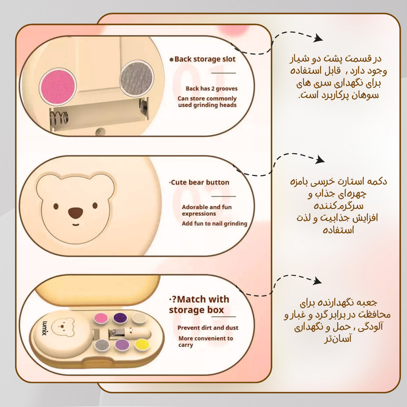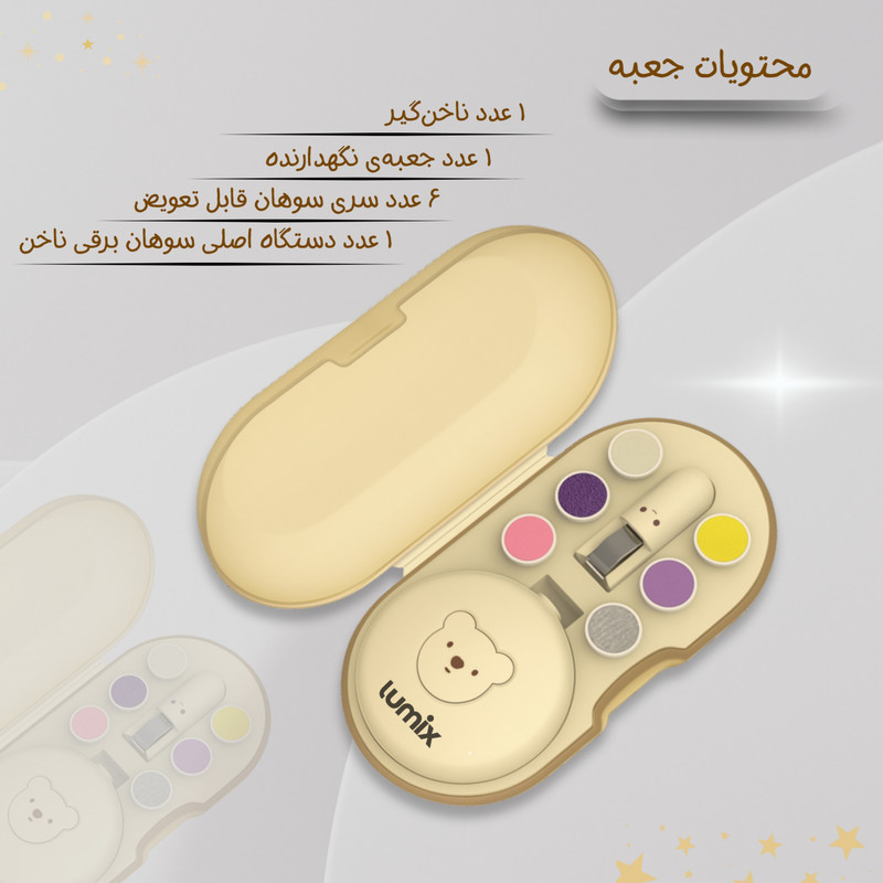 در داخل بستهبندی، ۶ سری مختلف سوهان قرار دارد که هر کدام برای سنین و نیازهای متفاوت طراحی شدهاند؛ از نوزادان چند ماهه گرفته تا کودکان بزرگتر و حتی بزرگسالان. این سریها امکان صافکردن، کوتاهکردن، فرمدهی و صیقلدادن ناخن را بدون ایجاد فشار یا آسیب فراهم میکنند. جنس سریها و نحوهی چرخش دستگاه باعث میشود تماس بسیار نرم و کنترلشده روی ناخن ایجاد شود و از تماس مستقیم با پوست و ایجاد حساسیت جلوگیری گردد.