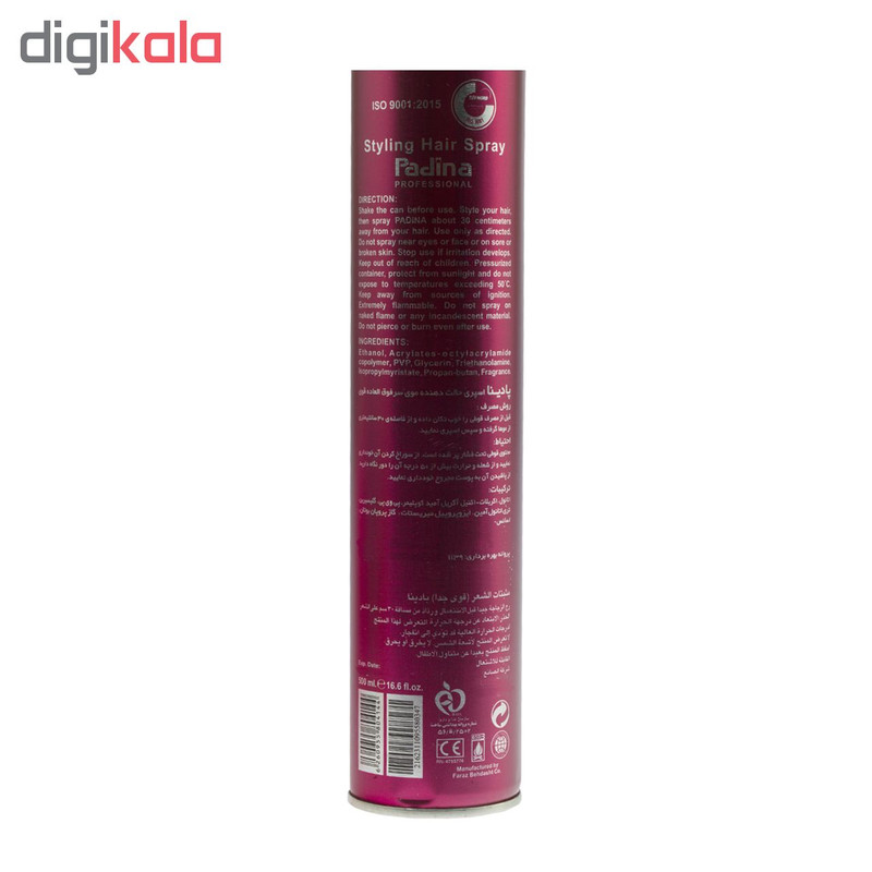 اسپری پادینا فوق العاده قوی با فرمولاسیون جدید و تاثیرگذاری طولانی مدت موهای شما را در حالت دلخواه تثبیت می نماید. اسپری موی پادینا با استفاده از مواد اولیه ویژه باعث شفافیت و درخشندگی موها میشود .این محصول جهت تقویت ساقه موها حاوی پرو ویتامین B5 می باشد. روش مصرف ابتدا قوطی را به خوبی تکان دهید و سپس از فاصله 30 سانتی متری بر روی موهای خشک اسپری نمایید. دور از دسترس اطفال نگهداری کنید. این قوطی تحت فشار پر شده است.دور از حرارت و تابش مستقیم آفتاب نگهداری نمایید. از تماس با چشم جلوگیری کنید و در صورت تماس با چشم ها با آب فراوان شستشو دهید و به مراکز پزشکی مراجعه نمایید.