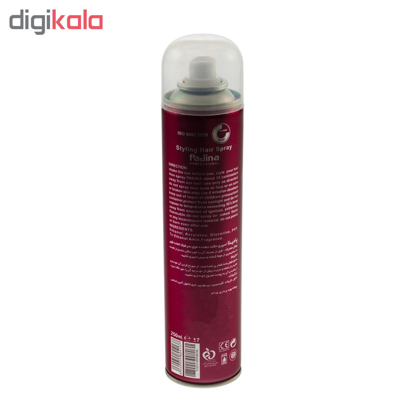 اسپری پادینا فوق العاده قوی با فرمولاسیون جدید و تاثیرگذاری طولانی مدت موهای شما را در حالت دلخواه تثبیت می نماید. اسپری موی پادینا با استفاده از مواد اولیه ویژه باعث شفافیت و درخشندگی موها میشود .این محصول جهت تقویت ساقه موها حاوی پرو ویتامین B5 می باشد. روش مصرف ابتدا قوطی را به خوبی تکان دهید و سپس از فاصله 30 سانتی متری بر روی موهای خشک اسپری نمایید. دور از دسترس اطفال نگهداری کنید. این قوطی تحت فشار پر شده است.دور از حرارت و تابش مستقیم آفتاب نگهداری نمایید. از تماس با چشم جلوگیری کنید و در صورت تماس با چشم ها با آب فراوان شستشو دهید و به مراکز پزشکی مراجعه نمایید.