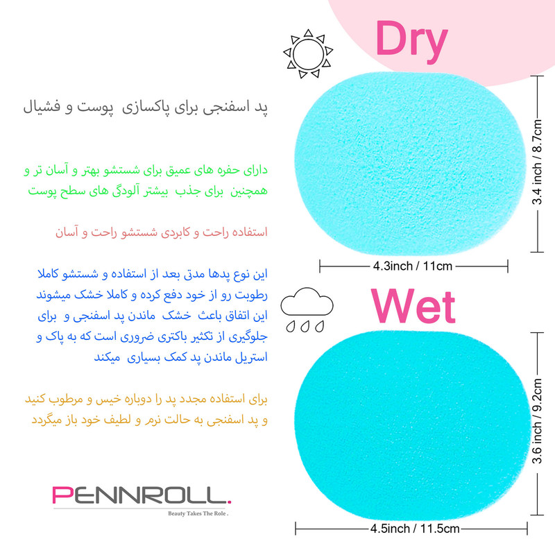 همانطور که میدانید پاکسازی پوست صورت یکی از مهمترین و تاثیرگذارترین موارد در افزایش جذابیت چهره و نشاط پوست بوده که پوستی تمیز و درخشان به ارمغان میآورد. با پد اسفنج پاک کننده صورت پنرول PENNROLL مدل PRP Facial Toast ، آرایش و یا هر نوع آلودگی ها سطح پوست خود را به راحتی و آسانی پاک نمایید. PENNROLL یکی از پیشروترین برندها در تولید محصولات و ابزار آرایشی هست که در این زمینه فعالیت داره. این مدل پدها پنرول کاملا نرم و لطیف بوده و هیچ آسیبی به بافت پوست نمیرساند و همچنین دارای حفره هایی هستند که برای پاکسازی پوست بسیار کاربردی و مفید می باشند. شما میتوانید از این محصول برای پاکسازی روزانه، فشیال، پاک کردن آرایش، ماساژ پوست، رطوبت گیری پوست، و همچنین برای انواع ماسک ها روی پوست و غیره... استفاده کنید. جهت استفاده از پدهای PRP Facial Toast پنرول بهتر است پد را به پاککننده یا ژل شستشو صورت آغشته نموده و با حرکاتی دورانی روی صورت بچرخانید تا تمام پوست صورت از آلودگیها و لوازم آرایشی پاک شود. این مدل پدهای پنرول قابلیت خود ایمنی در برابر هوا را دارند بطوریکه پس از استفاده اگر در محیط و بدن محفظه قرار گیرد بعد از مدتی کاملا رطوبت را از خود دفع کرده و کاملا خشک میشود و اجازه تکثیر باکتری را در محیط مرطوب خود را نمیدهد. زیرا باکتری ها در محیط مرطوب بسرعت تکثیر میشوند. این محصول از با کیفیت ترین مواد اولیه PVA ساخته شده و بدون تغییر فرم و شکل اولیه خود بارها قابل شستشو میباشد؛ اما توصیه میشود که پس از مدتی استفاده از پد را حدودا 1 الی 2 ماه تعویض نمایید.
