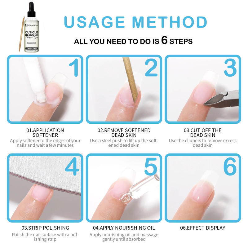 روش مصرف :محلول را دورتا دور ناخن بمالید و یک دقیقه منتظر شوید تا اثر کند. پس از آن با چرخاندن چوب کوچک مخصوص مانیکور همراه محصول که دور آن پنبه پیچیده اید آرام پوست روی صفحه ناخن را به عقب فشار دهید تا از روی آن برداشته شود. ناخنها را با آب و صابون بشویید و یا با دستمال مرطوب پاک کنید و خشک نمایید، میتوانید در پایان از روغن های تقویتی ناخن استفاده کنید.