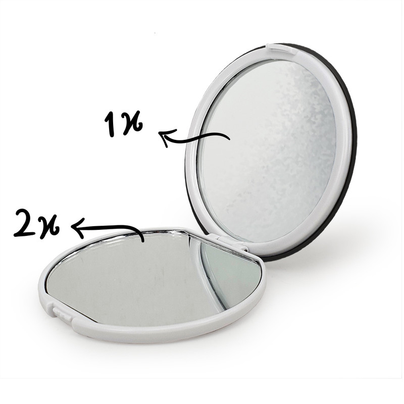 آینه های جیبی خندالو مدل تاشو، از جنس پلاستیک فشرده ABS تولید شده و به رنگ سفید می باشد. یکی از آینه ها ابعاد واقعی را نشان داده و دیگری با قابلیت بزرگنمایی، جزئیات را بهتر نمایش می دهد.