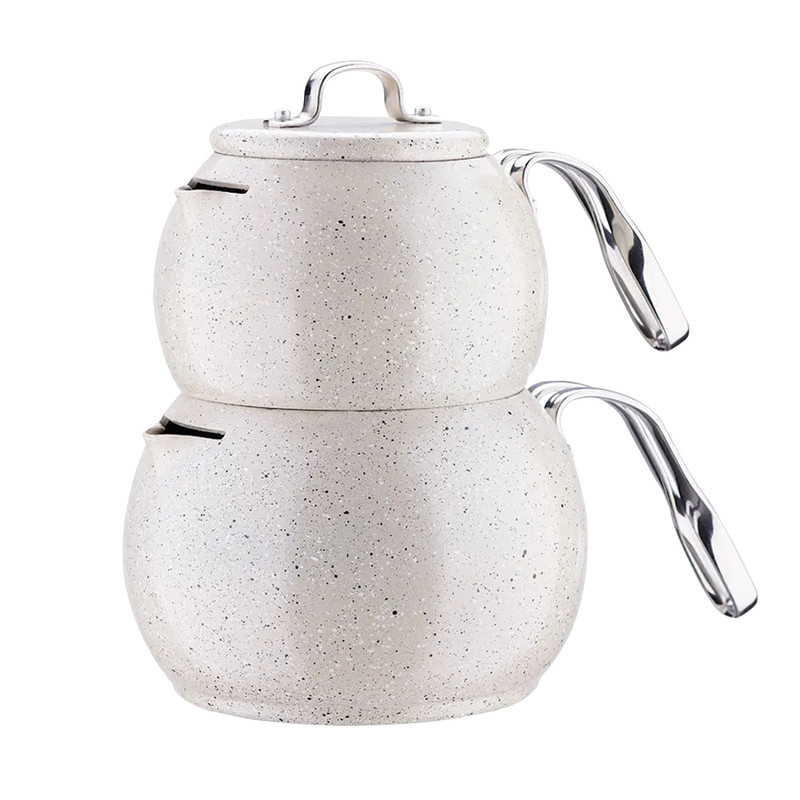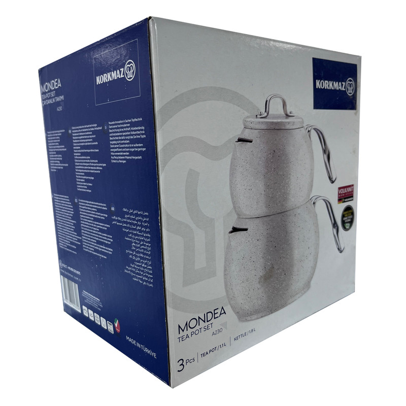 کتری قوری دارای بدنه الومینیومی با پوشش گرانیت می باشد.گنجایش کتری 1.8 لیتر و گنجایش قوری 1.1 لیتر میباشد.دسته های استیل ارگونومیک ب طوری طراحی شده که هم عایق (داغ نمیشوند) و کمترین فشار ب دست وارد میکند