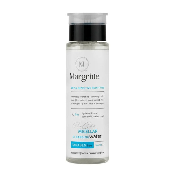 میسلار واتر 3 در 1 پوست خشک و حساس مارگریت بدون نیاز به آبکشی تمامی آلودگیها، آرایش چشم، صورت و لب حتی مواد ضد آب را پاک میکند و نرمی و لطافت پوست را به ارمغان میآورد. این محصول مناسب پوست خشک و حساس بوده و یکی از محصولات آرایشی و بهداشتی جهت پاک کردن آرایش و آلودگیهای پوست بوده و قادر است تمامی انواع آرایشها به خصوص مواد آرایشی ضد آب و آلودگی را پاک کند. این محصول ضد قارچ و ضد باکتری میباشد. علاوه بر این بدون ایجاد خشکی روی پوست، قادر است تا آلودگیها و چربیهای اضافه روی پوست صورت را پاک کند. با استفاده از این محصول نرمی و لطافت را مهمان پوست خود میکنید. محلول پاک کننده آرایش مارگریت فاقد پارابن، الکل و صابون بوده و بدون نیاز به آبکشی است.میسلار واتر پوست خشک مارگریت حاوی ترکیبات مرطوب کننده و رطوبت رسان می باشد. در کنار پاک کردن آلودگی ها از روی پوست، آن را آبرسانی کرده و مانع از خشکی و دهیدراته شدن پوست می گردد. این محصول پوست را شما را شاداب و با طراوت کرده و به سلامت و هیدراته ماندن آن نیز کمک می کند. این میسلار واتر سرشار از ترکیبات ضد التهابی بوده و به همین خاطر از بروز حساسیت های پوستی و قرمزی و سوزش پوست جلوگیری می کند. همچنین آرام بخش و التیام بخش پوست های ملتهب است.