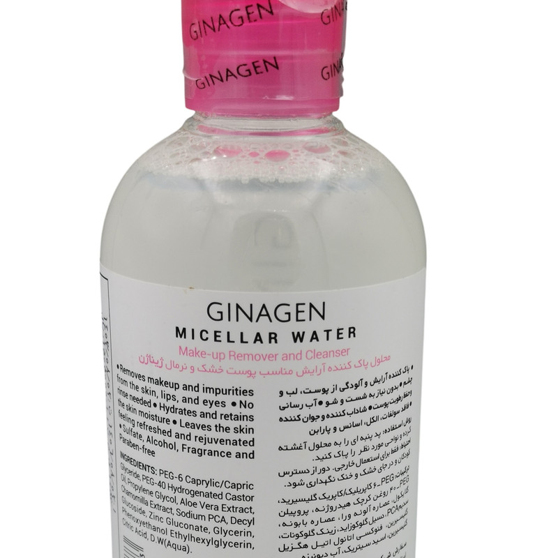 میسلار واتر پوست خشک ژیناژن با تنظیم تعادل PH به کمک اسید سیتریک، از خشکی و التهاب جلوگیری میکند. ترکیبات مغذی همچون: روغن کرچک هیدروژنه و زینک گلوکونات، به تقویت و بازسازی بافتهای پوستی میپردازند. بدون نیاز به آبکشی، استفاده از آن بسیار سریع و آسان است. دسیل گلیکوزید موجود در آن، پاکسازی عمقی منافذ را تضمین کرده و اثری لطیف و سبک روی پوست بر جای میگذارد.