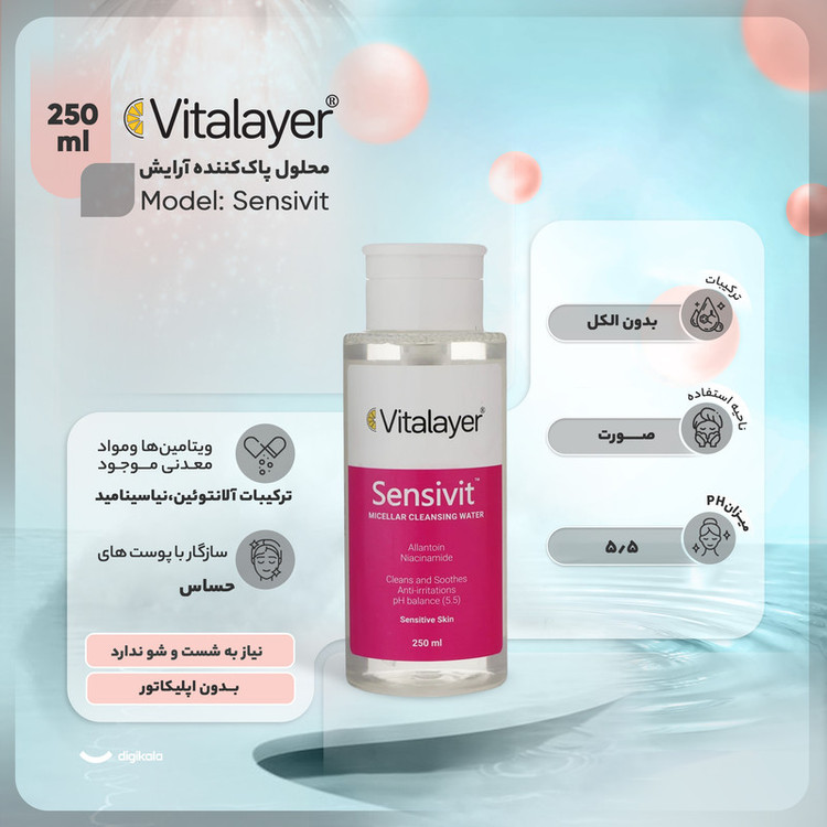 سایر توضیحات : محلول پاک کننده آرایش سنسی ویت ویتالیر مناسب پوست حساس بوده و با فرمولاسیون ملایم علاوه بر پاک کردن آلودگی از روی پوست، خاصیت التیام بخشی و ضدالتهاب نیز دارد. این محلول بدون نیاز به شستشو با آب است.