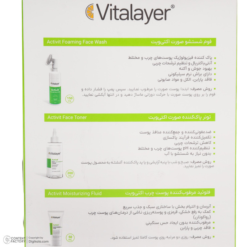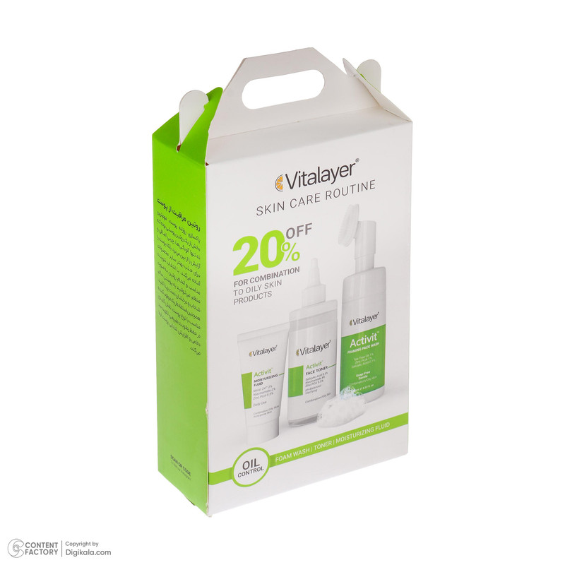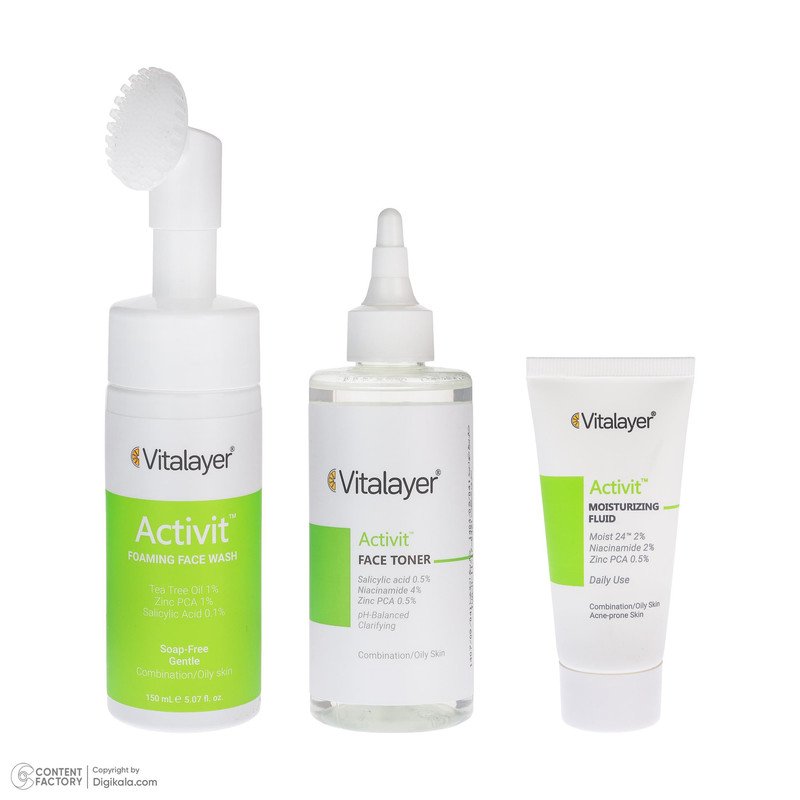 فوم شست‌وشوی صورت ویتالیر مدل Activit مناسب برای پوست چرب حجم 150 میلی‌لیتر به همراه تونر پاک‌کننده صورت ACTIVIT مناسب برای انواع پوست حجم 200 میلی لیتر و فلوئید مرطوب‌کننده صورت ACTIVIT مناسب برای پوست چرب حجم 50 میلی‌ لیتر