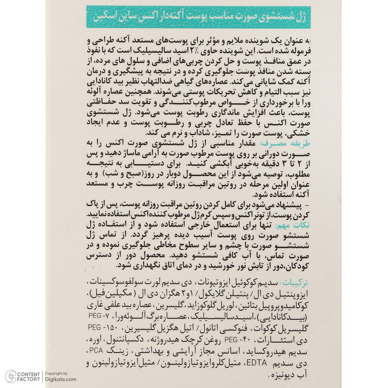 ژل شستشوى صورت مناسب پوست آكنه دار اكنس ساين اسكين به عنوان یک شوينده ملايم و موثر براى پوست هاى مستعد آكنه طراحى و فرموله شده است. اين شوينده حاوى 1% اسيدساليسيليک است، كه با نفوذ در عمق منافذ پوست و حل كردن چربیهاى اضافى و حذف سلولهاى مرده، از بسته شدن منافذ پوست جلوگیرى كرده و در نتيجه به پيشگيرى و درمان آكنه كمک شايانى میکند.