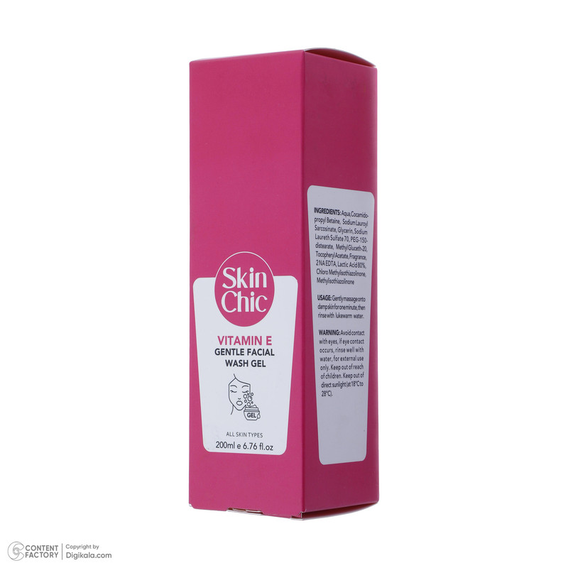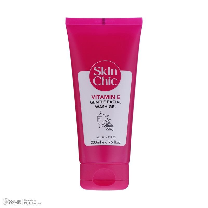 ژل شستشوی صورت اسکین شیک، سازگار با انواع پوست، با خاصیت شوینده ملایم، دارای گلیسیرین و اسید لاکتیک 80 درصد، مناسب برای بانوان و آقایان، حجم 200 میلی‌لیتر، مدل Vitamin E