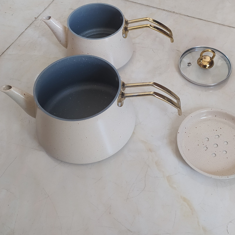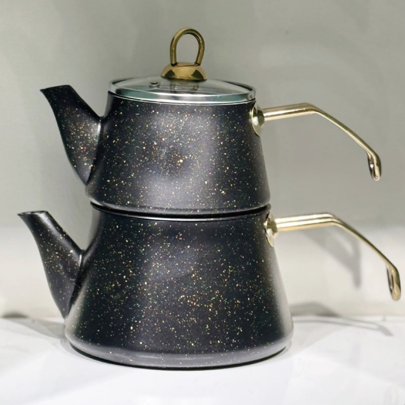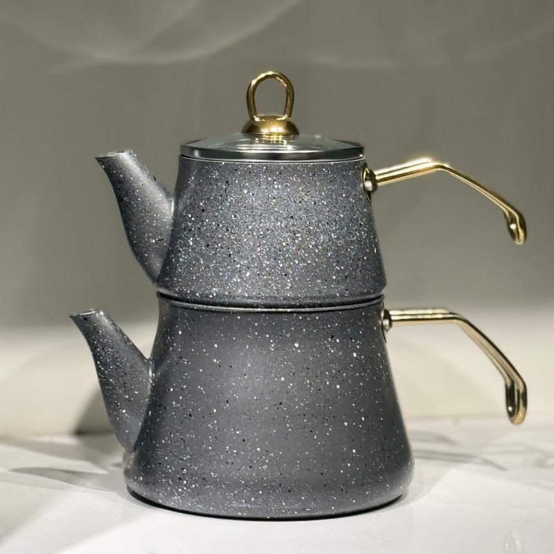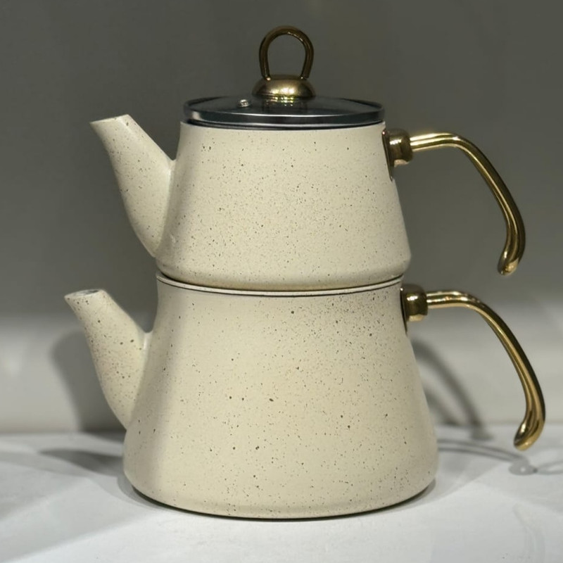 ست کتری و قوری گرانیتب با صفحه اضافی برای استفاده از قوری های متفرقه و محافظ برای جلوگیری از سوختگی دست در مقابل بخار داغ آب جوش در حین ریختن )) یکی از بهترین گزینه های ممکن برای یک ست کتری و قوری با جنس گرانیت NON-STICK درجه یک میباشد. از کاربردهای صفحه اضافه میتوان برای جایگزاری قوری های پیرکس یا چینی نام برد. جنس عالی پوشش گرانیتی این ست را از سایر برند ها متمایز ساخته است. دسته های استیل طلایی رنگ در برابر حرارت و آتش مقاوم است