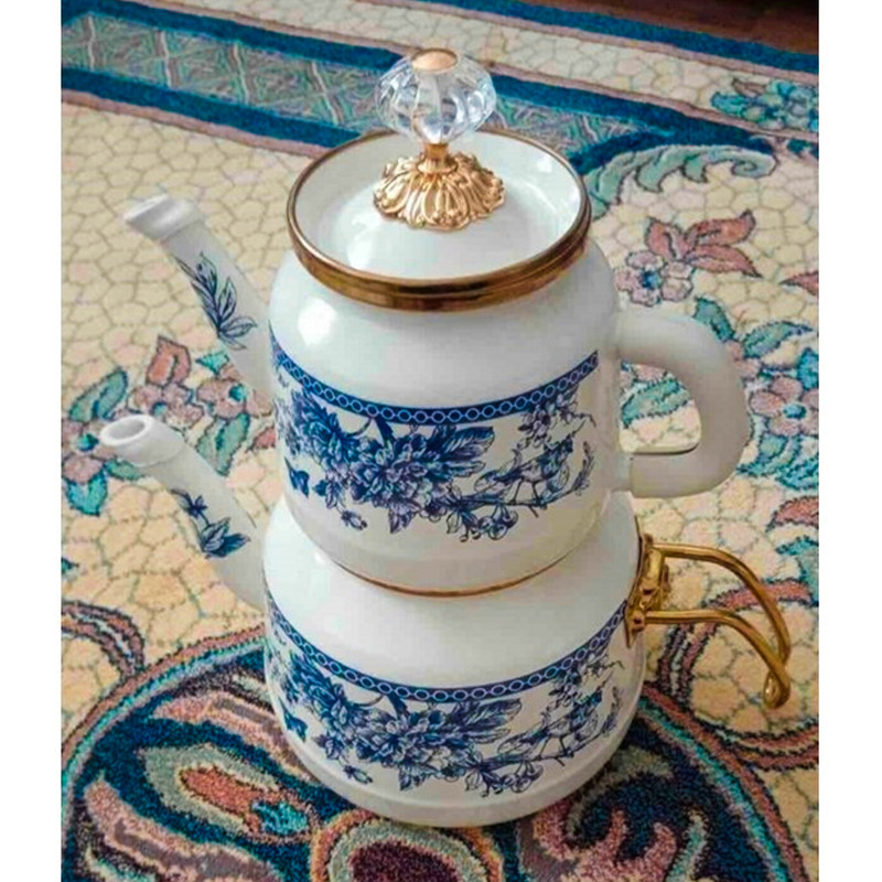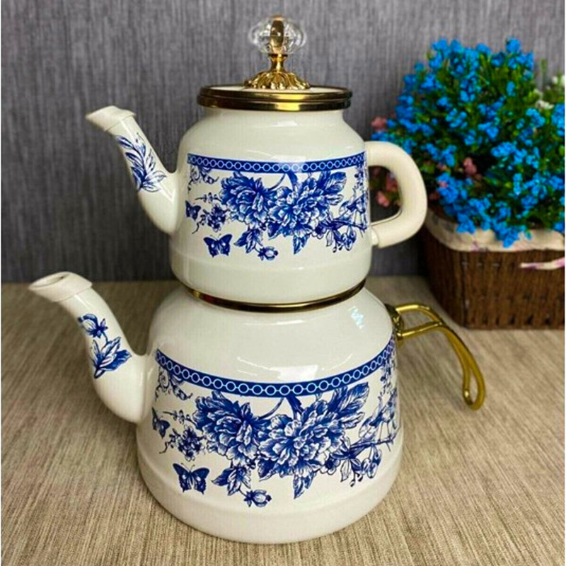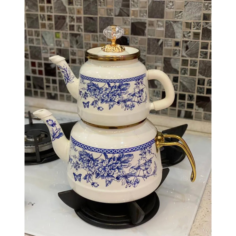 قوری کتری لعابی مدل دافی یک قوری کتری شناخته شده از کشور ترکیه میباشد که طذپرح زیبا و ظریف با گلهای ابی دارد ویک طرح کلاسیک از این برند است قوری داریدرب میباشد ولی کتری درب ندارد و یک مجموعه سه تکه میباشد برای شعله مستقیم اسن بدون تغییر رنگ سالها یار اشپزخانه شما خواهد بود قوری دارای دسته سیلیکونی میباشد که قابل جدا شدن است برای جلوکیری از داغ شدن دست شما قسمت سر لوله قوری وکتری هم دارای محافظ سیلیکونی میباشددرب قوری دارای دستگیره بشکل گوی الماس است که بخودی خود بسیار منحصربفرد میباشد گنجایش کتری2.5 لیتر وگنجایش قوری 1.1 لیتر میباشد قطر کتری 18سانتیمتر ارتفاع 14 سانتیمتر است وزن کتری یک کیلو گرم میباشد قطر قوری 13 سانتیمتر ارتفاع با درب 18 سانتیمتر است وزن قوری685 گرم میباشد