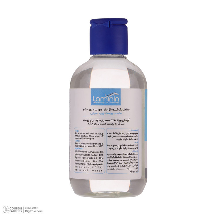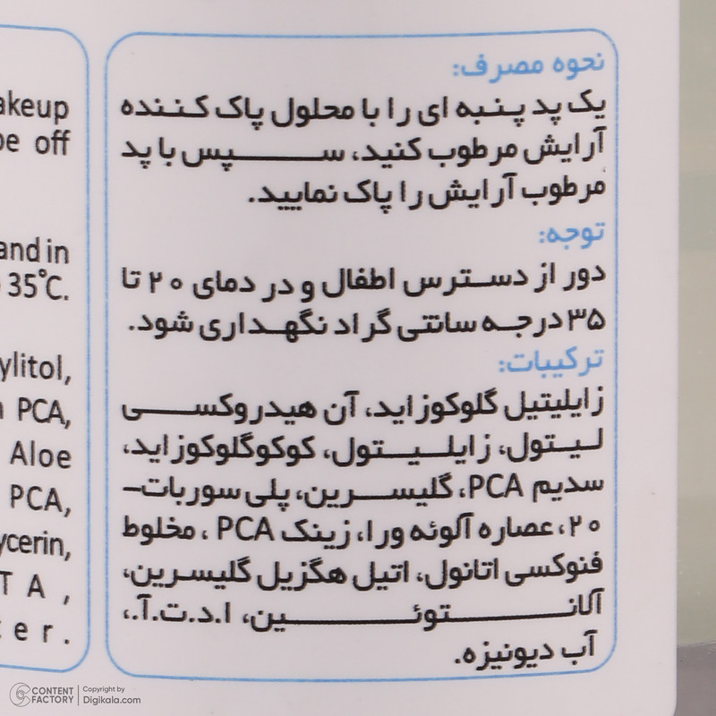 راهنمای استفاده : یک پد پنبهای را با محلول پاککننده آرایش مرطوب کنید. سپس با پد مرطوب آرایش را پاک نمایید و در نهایت با آب ولرم صورت خود را آبکشی کنید.