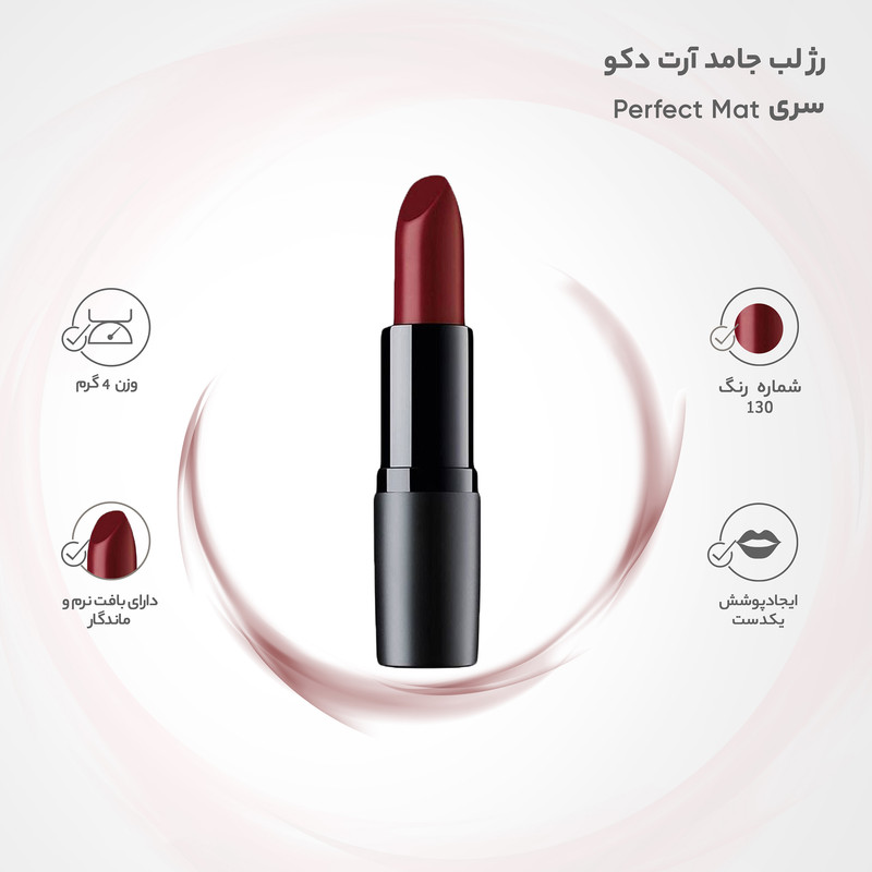 اگر پوستی روشن، گندمی و یا حتی کمی سبزه دارید و همینطور از آرایشهایی با رنگ گرم لذت میبرید رژلب شمارهی 130 برند «آرت دکو» (Artdeco) برایتان مناسب خواهد بود. رژلب جامد و غنی شدهی آرت دکو سری «Perfect Mat» تن رنگ آلبالویی-زرشکی دارد و تنها 4 گرم وزن آن است که در محفظهای پیچی و دردار قرار داده شده است. آرت دکو با پوست لبها سازگار است و از خشکی پوست لب و ترک خوردن آن جلوگیری میکند که معولاً این مدل رژلبها برای مصرف روزانه مناسب هستند. بافت نرم و لطیفی که رژلب جامد آرت دکو دارد بر روی لبها سنگینی به وجود نمیآورد و بر روی لب ماسیده نمیشود. رژلب سری Perfect Color آرت دکو حاوی نرم کننده است و رطوبت موردنیاز لبها را به آنها میرساند. آرت دکو با ایجاد پوششی یکدست زیبایی خاصی به لبها میبخشد.