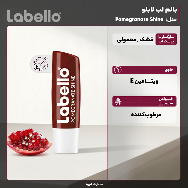 بالم لب «لابلو» (Labello) مدل «Pomegranate » دارای اسانس انار است که رایحه و طعمی بسیار خوشایند دارد. استفاده از این بالم لب 4.8 گرمی بسیار آسان است. همچنین از نوع ماتیکی است و مانند رژلب استفاده میشود. لابلو قادر است لبهایتان را مرطوب و چرب نگه دارد و از خشک و پوستهپوستهشدن آنها جلوگیری کند. لابلو لبها را نرم و لطیف کرده و رطوبت لازم را به لبها میرساند. بالم لب لابلو فاقد الکل است و هیچگونه آسیبی به پوست لبها نمیرساند؛ علاوهبراین باعث ایجاد درخششی زیبا و طبیعی روی لبها خواهد شد. برای رطوبترسانی و چرب نگهداشتن لبها، در هر زمانی و بدون محدودیت میتوان از بالم لب استفاده کرد.
