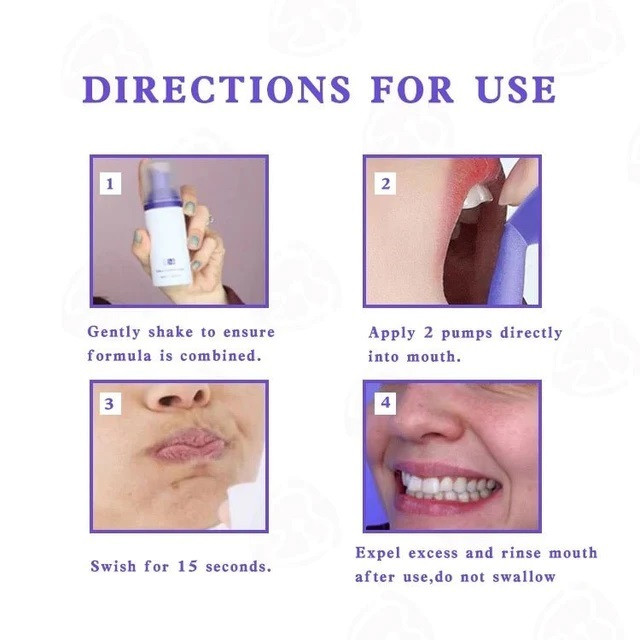 طریقه مصرف:ابتدا دندان هایتان را مسواک بزنید سپس دو بار این فوم را در دهان خود اسپری بکنید و به مدت 15 ثانیه در دهان خود بچرخانید و سپس دهان خود را با آب ولرم بشویید. هشدار این محصول را از کودکان دور نگه دارید و اصلا آن را قورت ندهید.