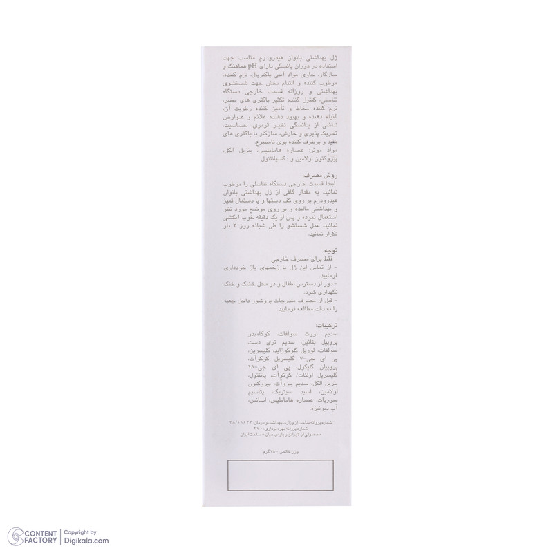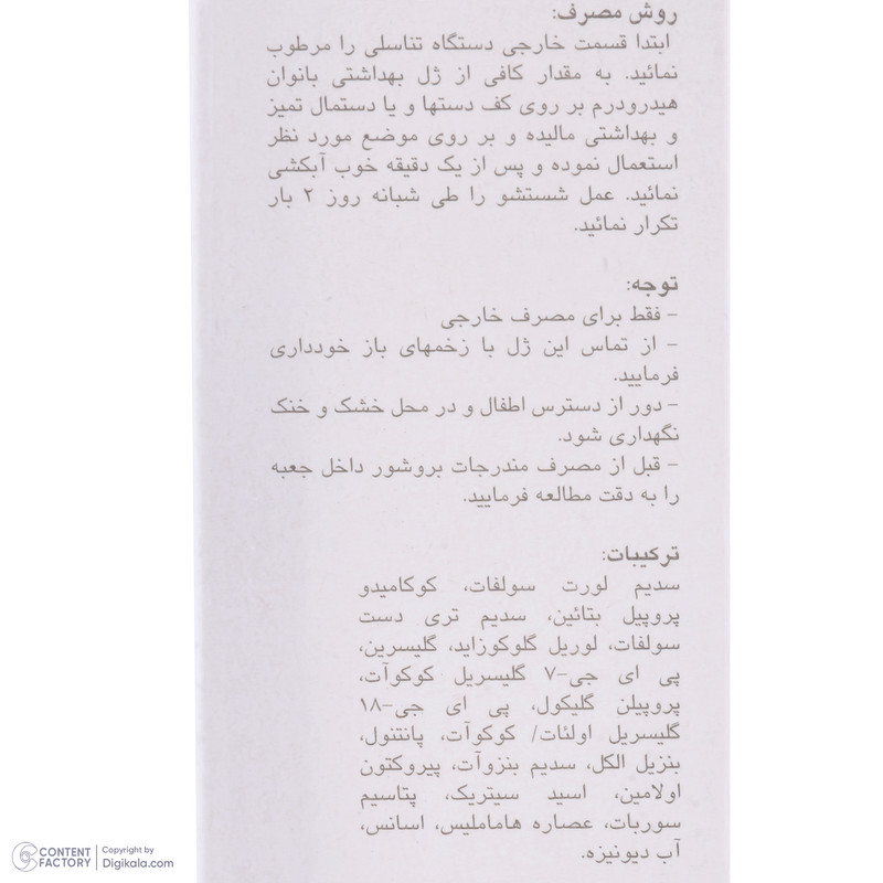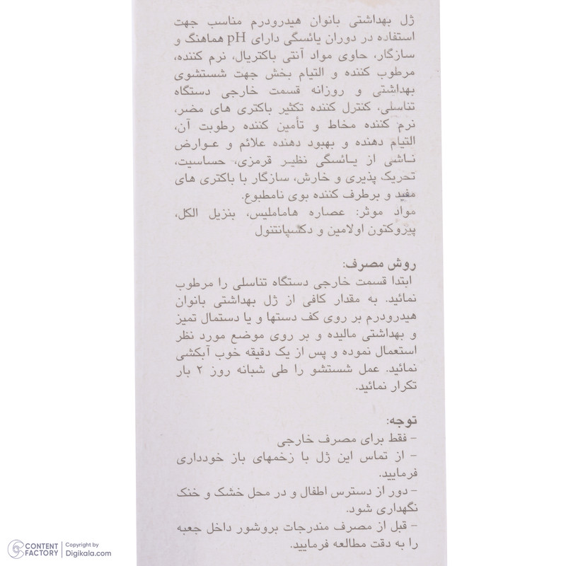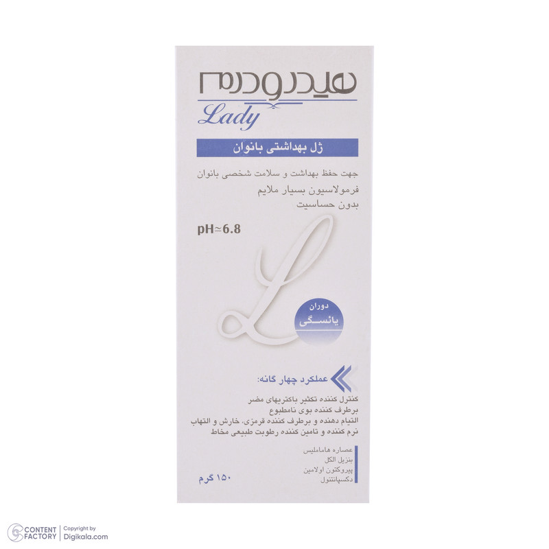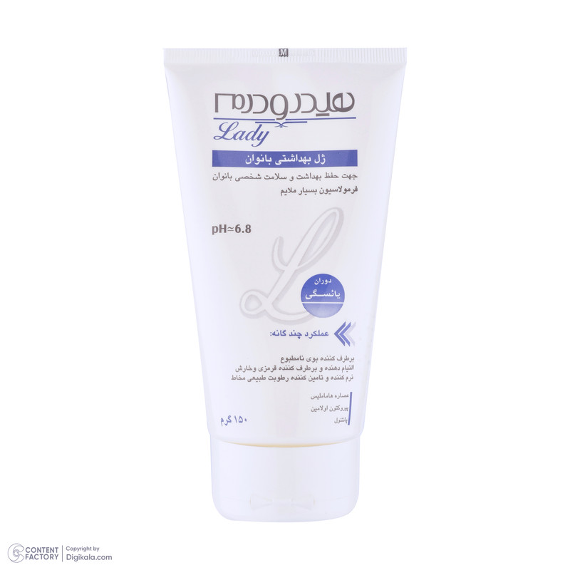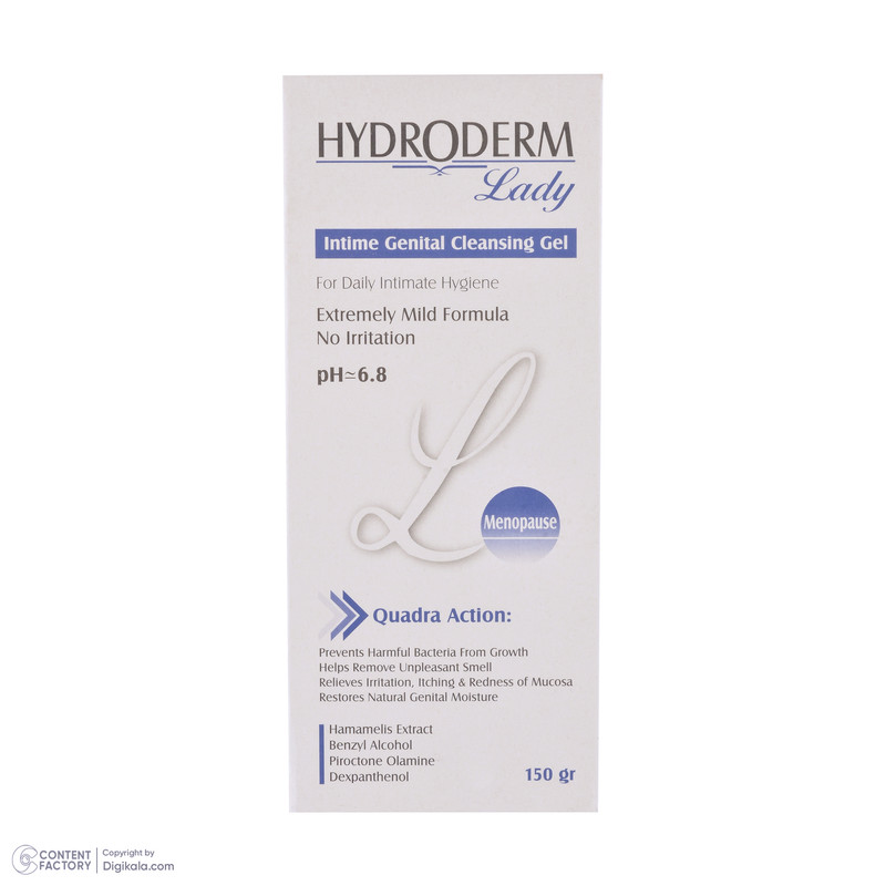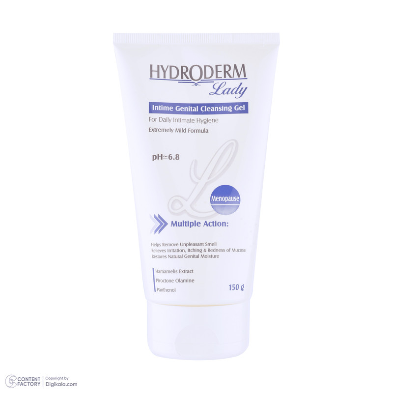 ژل شستوشوی بهداشتی دوران یائسگی هیدرودرم نرم كننده، مرطوب كننده و التیام بخش جهت شستوشوی بهداشتی و روزانه قسمت خارجی دستگاه تناسلی است. این محصول مناسب جهت استفاده در دوران یائسگی هماهنگ و سازگار با پوست است. ژل شستوشوی هیدرودرم حاوی مواد آنتی باكتریال بوده که كنترل كننده تكثیر باكتریهای مضر، نرم كننده مخاط و تامین كننده رطوبت آن است. این فرآورده را میتوان به عنوان یک التیامدهنده علائم و عوارض ناشی از یائسگی نظیر قرمزی، حساسیت، تحریک پذیری و خارش در نظر گرفت. همچنین برطرف كننده بوی نامطبوع قسمت خارجی دستگاه تناسلی نیز است. برای استفاده از این ژل ابتدا قسمت خارجی دستگاه تناسلی را مرطوب کنید، به مقدار کافی از ژل روی دست یا دستمال تمیز مالیده و روی موضع استعمال نمایید و بعد از یک دقیقه آبکشی کنید.