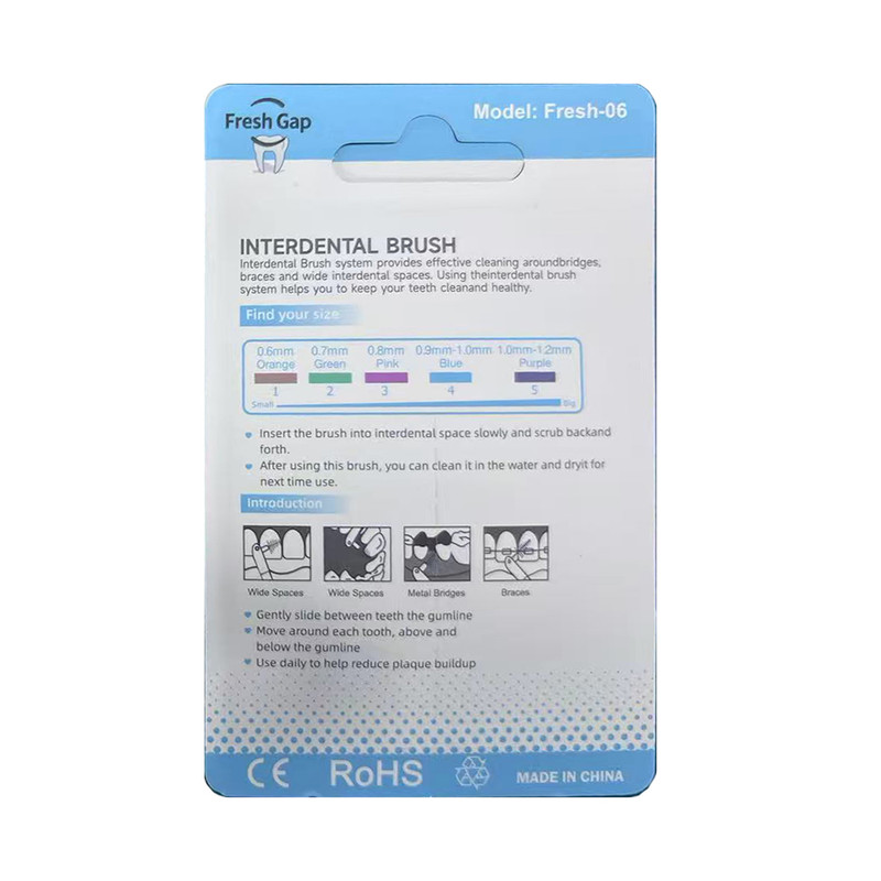 مسواک بین دندانی از برند Fresh Gap مدل Fresh 06 بسته 5 عددی از سری Deep Cleaning دارای 5 عدد مسواک بین دندانی نازک در یک بسته از محصول است. ضخامت این مسواک های ظریف و با کیفیت در این مدل 0.6 میلی متر است. این مسواک بین دندانی جهت پاکسازی فواصل بین دندانی ، پاک سازی اطراف دندان های ایمپلنت شده ، پاک سازی اطراف براکت ها ، پاک سازی زیر بریچ ها ، پاک سازی دندان های ارتودنسی شده و... کاربرد دارد.
