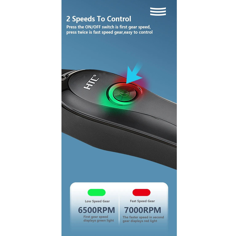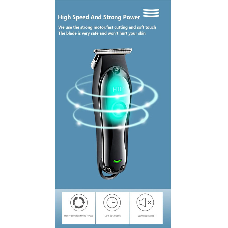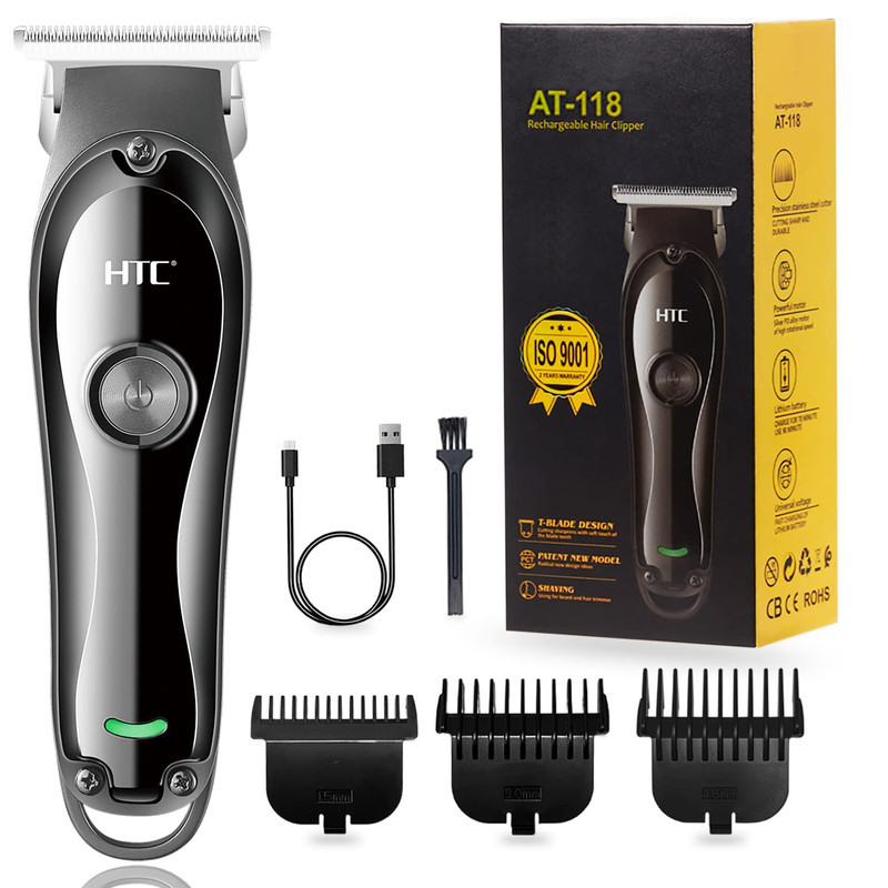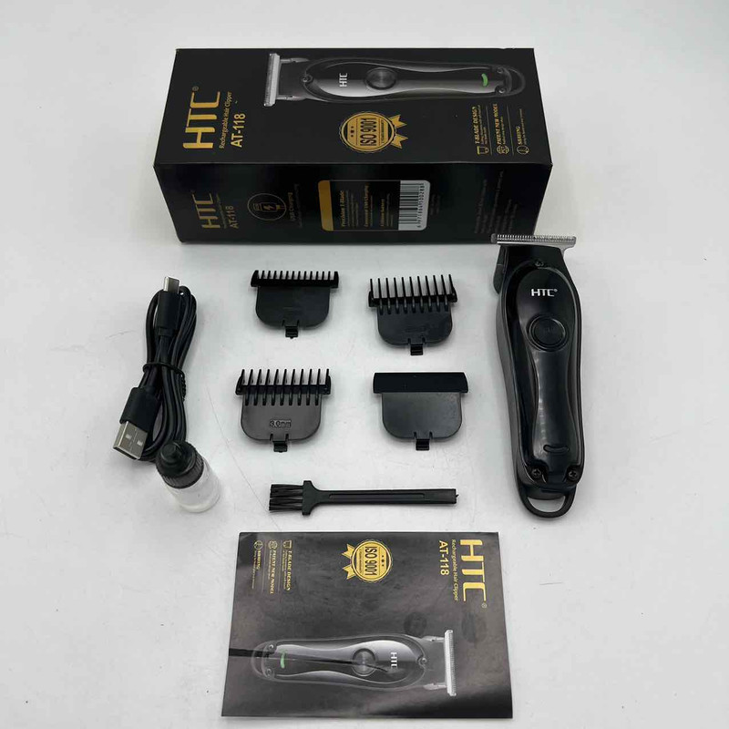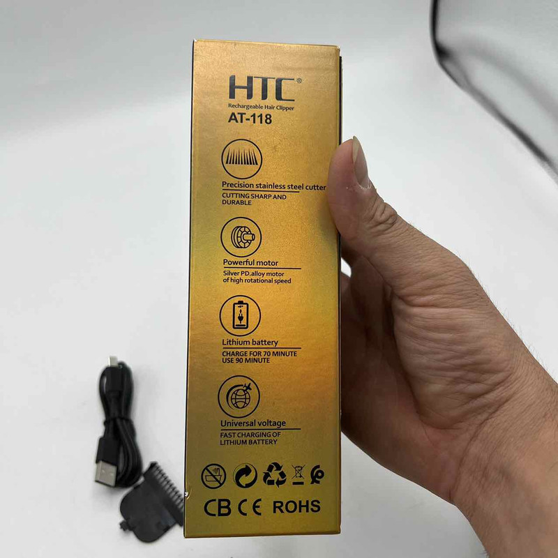 ماشین اصلاح اچ تی سی AT-118 یک ماشین اصلاح بسیار با کیفیت با طراحی ارگونومیک میباشد این دستگاه دارای یک نماد LED میباشد که حالت شارژ و 2 سرعت دستگاه را نشان میدهد.این ماشین اصلاح قابلیت این دوسرعته شدن دارد و همچنین قابلیت استفاده همزمان با برق و شارژ را دارد.و دارای 3 عدد شانه 1.5 و 3 و 4.5 میباشد و جنس تیغه استیل پیشرفته است که دارای طول عمر بالا میباشد . نکته و تجربه شخصی بنده در نگاه اول به دستگاه دقت بسیار بالای تیغه هنگام تراش و اندازه بسیار مناسب دستگاه حس خوش دستی رو به آدم میده رنگ مشکی پرکلاغی و کیفیت خوب دستگاه رو آدم توی نگاه اول میفهمه اما اندازه دستگاه کوچک هست و برای اصلاح موی سر اصلا توصیه نمیشه .