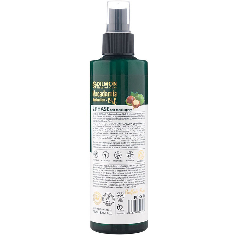 سرم مو دو فاز دیلمون حاوی روغن ماکادمیا محصولی از برند ایرانی دیلمون است. موهای آسیب دیده، رنگ شده، هایلایت و دکلره شده نیاز به مراقبت ویژه دارد. این محصول کاربردی از مو در برابر حرارت محافظت می کند و با ایجاد یک لایه محافظ از وز و موخوره مو جلوگیری می کند. این سرم مو دو فاز خاصیت نرم کنندگی و تقویت کنندگی تارهای آسیب دیده مو را دارد. استفاده از این محصول استحکام مو را افزایش می دهد و با نرم کنندگی مو، شانه پذیری مو را به آسانی فراهم می کند. این سرم فاقد سولفات است؛ التهاب، قرمزی و خارش برای مو ایجاد نمی کند و هنگامی که قبل براشینگ و اتوکشی بر روی مو اسپری می شود علاوه بر درمان تارهای آسیب دیده موهایی شفاف و درخشان را به شما هدیه می دهد