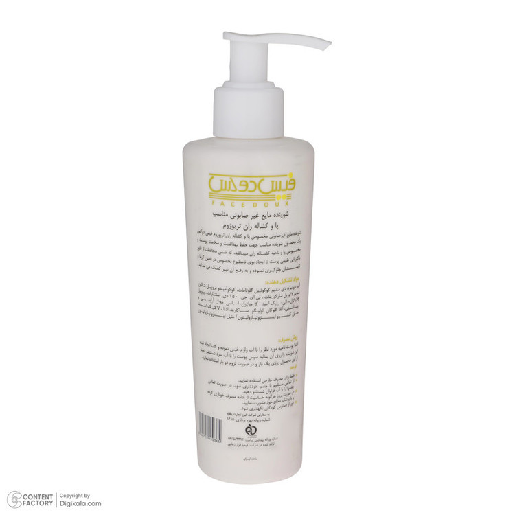راهنمای استفاده: ابتدا پوست را با آب ولرم خیس کنید و کف ایجاد شده از این محصول را روی آن بمالید و سپس پوست را با آب کمی سرد تر آبکشی کنید.
